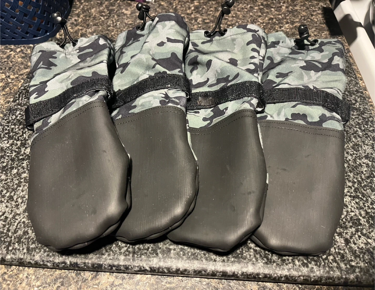 Barely used “Canada Pooch” Winter Camo Dog Boots (Size 6). Perfect for large/extra large dogs. Great quality and unique look. My pup has new boots. Purchased $75. Hope finds a new home. Specs below.