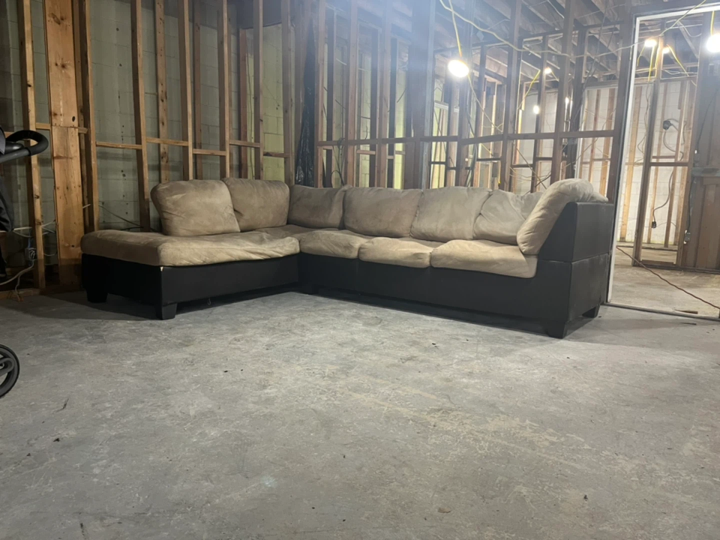 Selling a sectional sofa with a brown cushion and black base. It's in good condition and would be great for a living room or basement space. It is a comfortable and sturdy piece of furniture