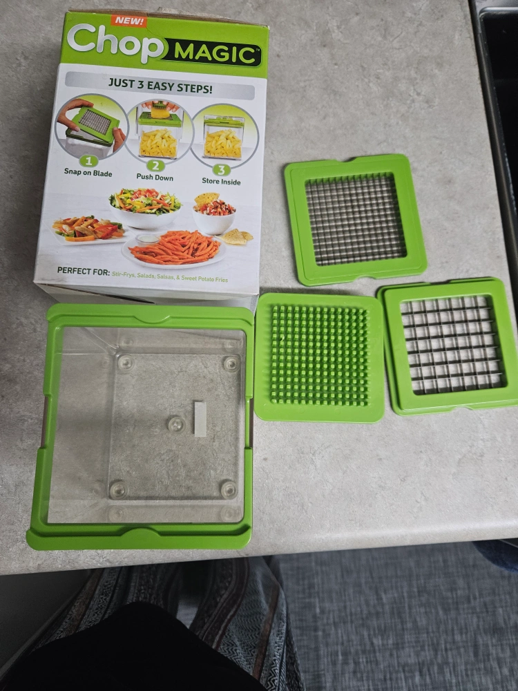 I'm selling a Chop Magic food chopper! It makes chopping veggies for stir-fries, salads, salsas, and sweet potato fries super easy. It works in just 3 easy steps: snap on the blade, push down, and store inside. It's perfect for quick meal prep!