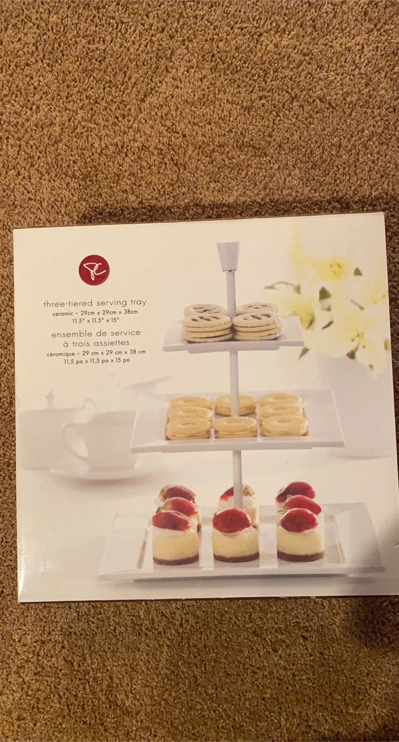 Selling a NEW unused (still in original packaging) Presidents Choice three-tiered serving tray! It's ceramic and measures 29cm x 29cm x 38cm, or 11.5" x 11.5" x 15".