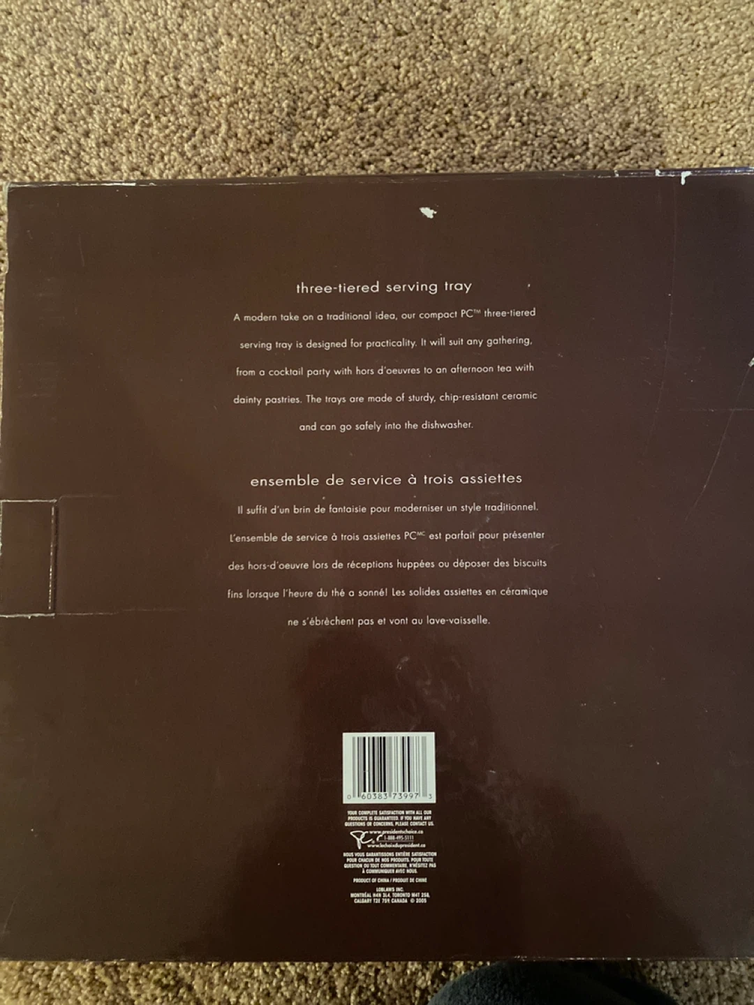 Selling a NEW unused (still in original packaging) Presidents Choice three-tiered serving tray! It's ceramic and measures 29cm x 29cm x 38cm, or 11.5" x 11.5" x 15".