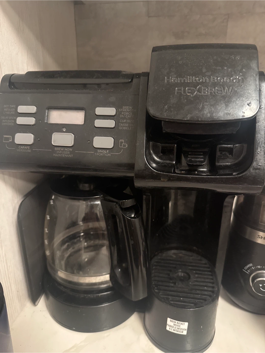 Selling a Hamilton Beach FlexBrew coffee maker. It can brew a full carafe or a single portion. It has settings for brew strength and cup size. Brew basket is included