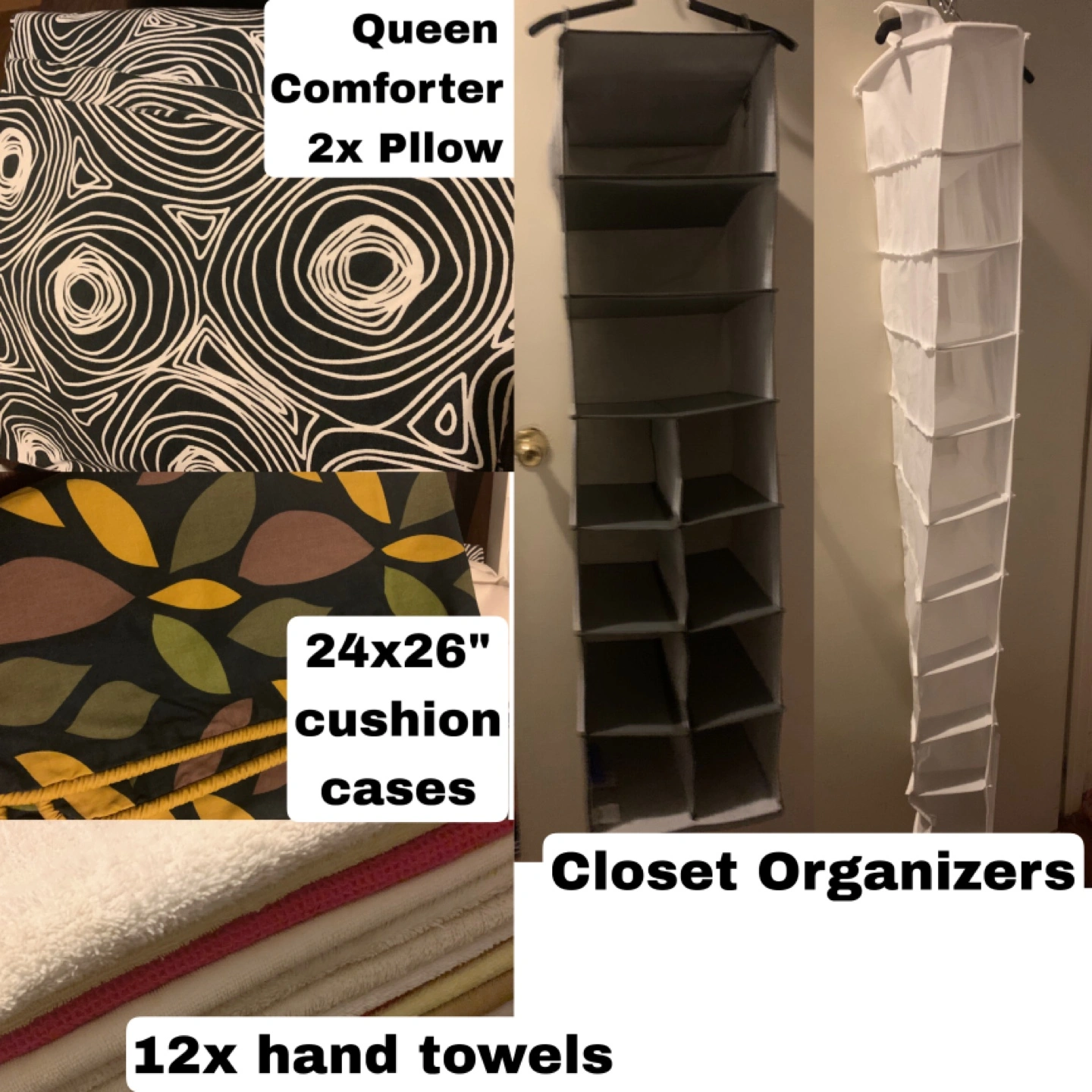 I have a queen comforter with two pillowcases, 24x26" cushion cases, 12 hand towels, and closet organizers for sale
