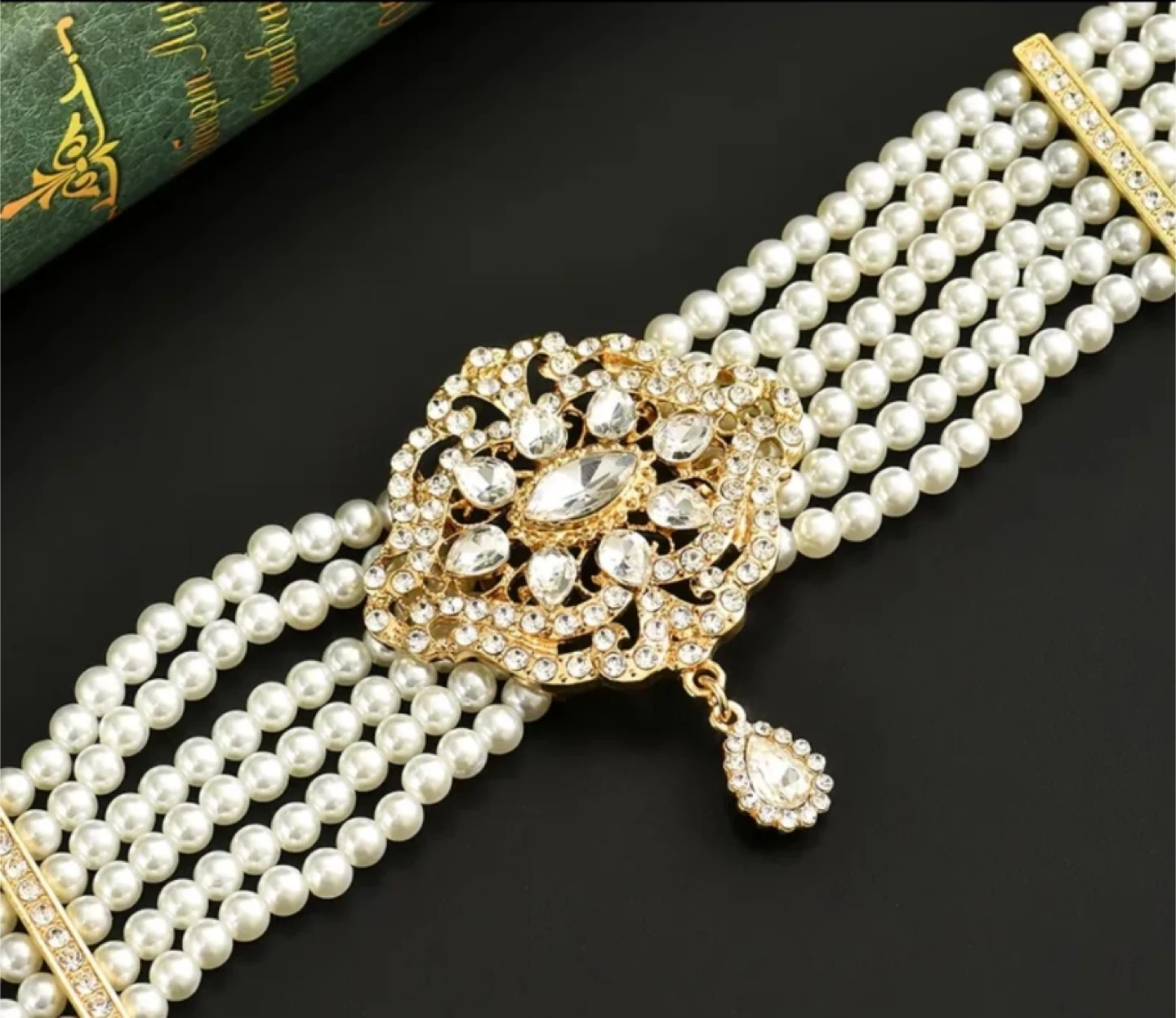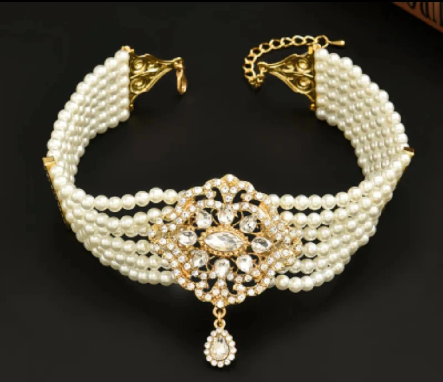 This is a beautiful pearl and rhinestone choker necklace. It features a gold-tone setting with faux pearls and sparkling rhinestones. Perfect for adding a touch of elegance to any outfit!