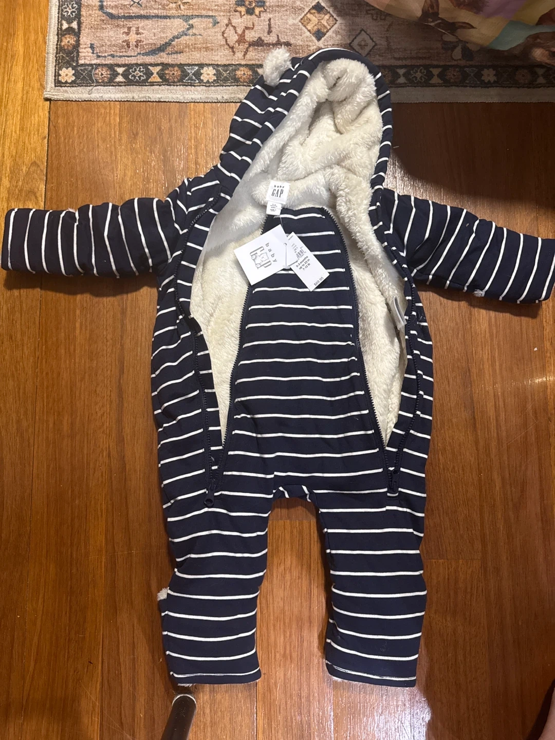 I have a brand new with tags Baby Gap snowsuit for sale! It's a super cute striped design in navy and white, perfect for keeping your little one warm this winter. It's sized for 0-3 months and features a cozy, soft lining.