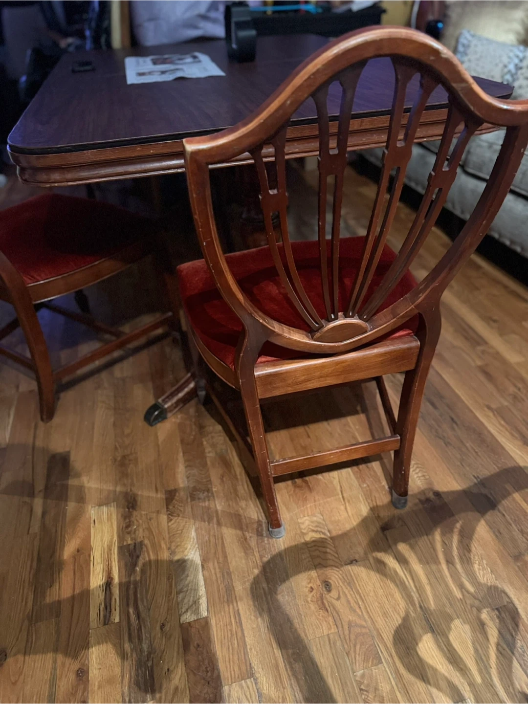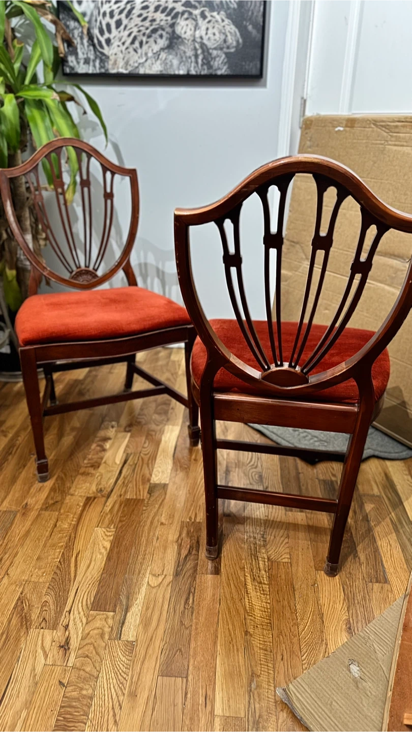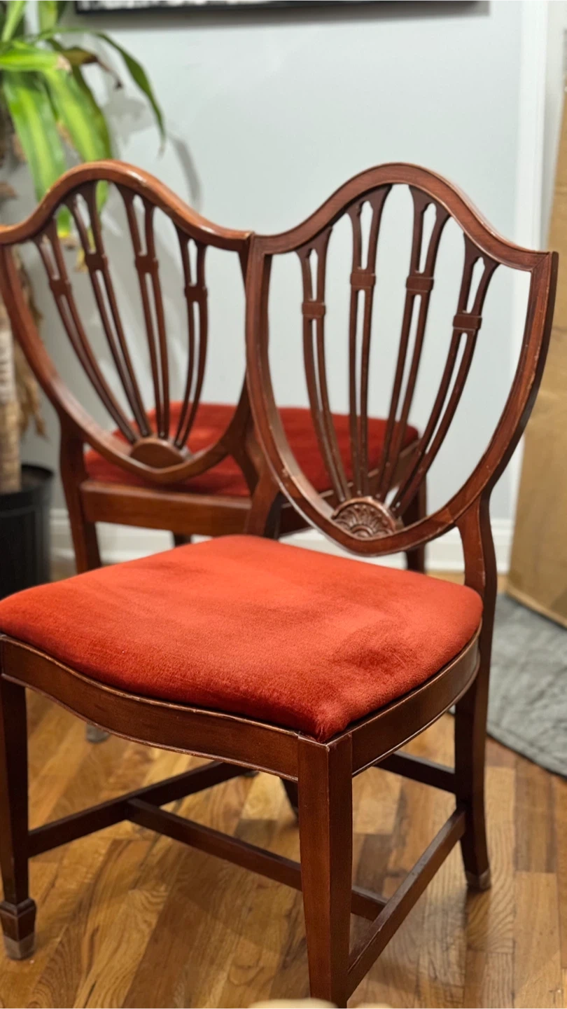 Selling a set of two antique dining chairs. They feature a beautiful red velvet seat and a unique shield back design. The chairs are made of wood and would add a touch of elegance to any dining room