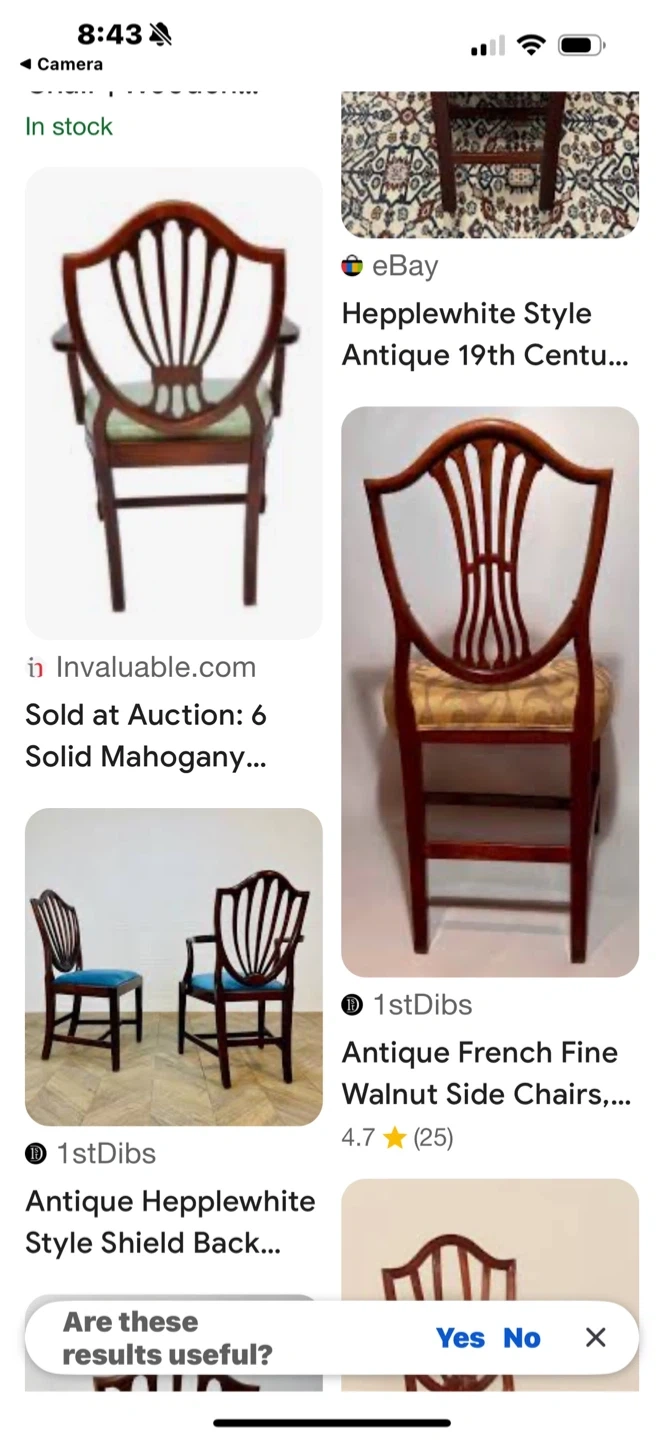 ANTIQUE pair of High Quality Hepplewhite Style Shield Back Dining Side Chairs with mahogany frames Features Classic Shield Backs With Carved Spade Splats, Upholstered Seats, And Sturdy Wood Frames.