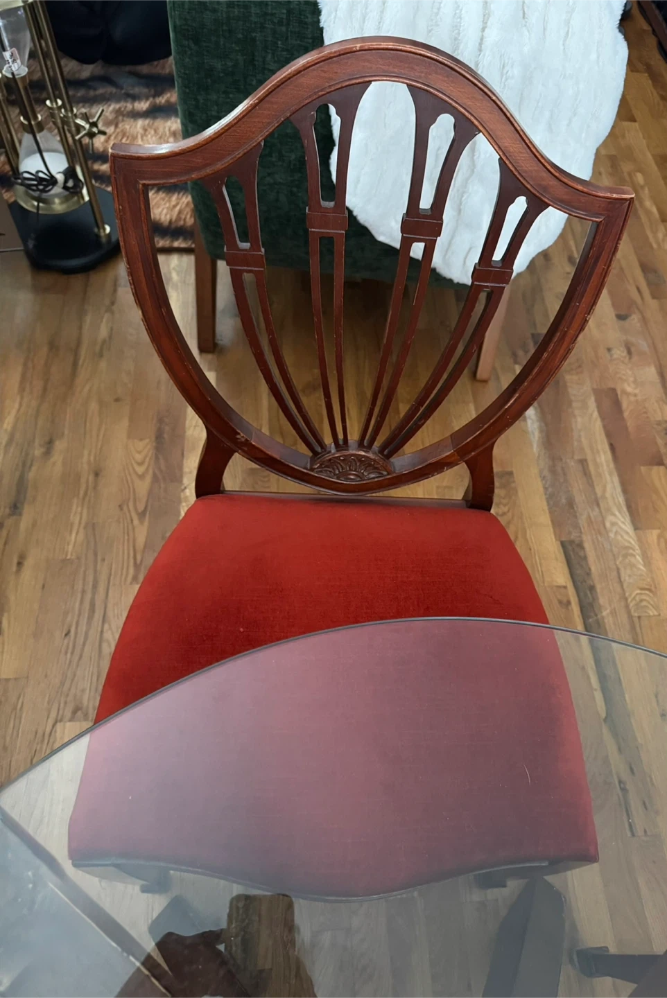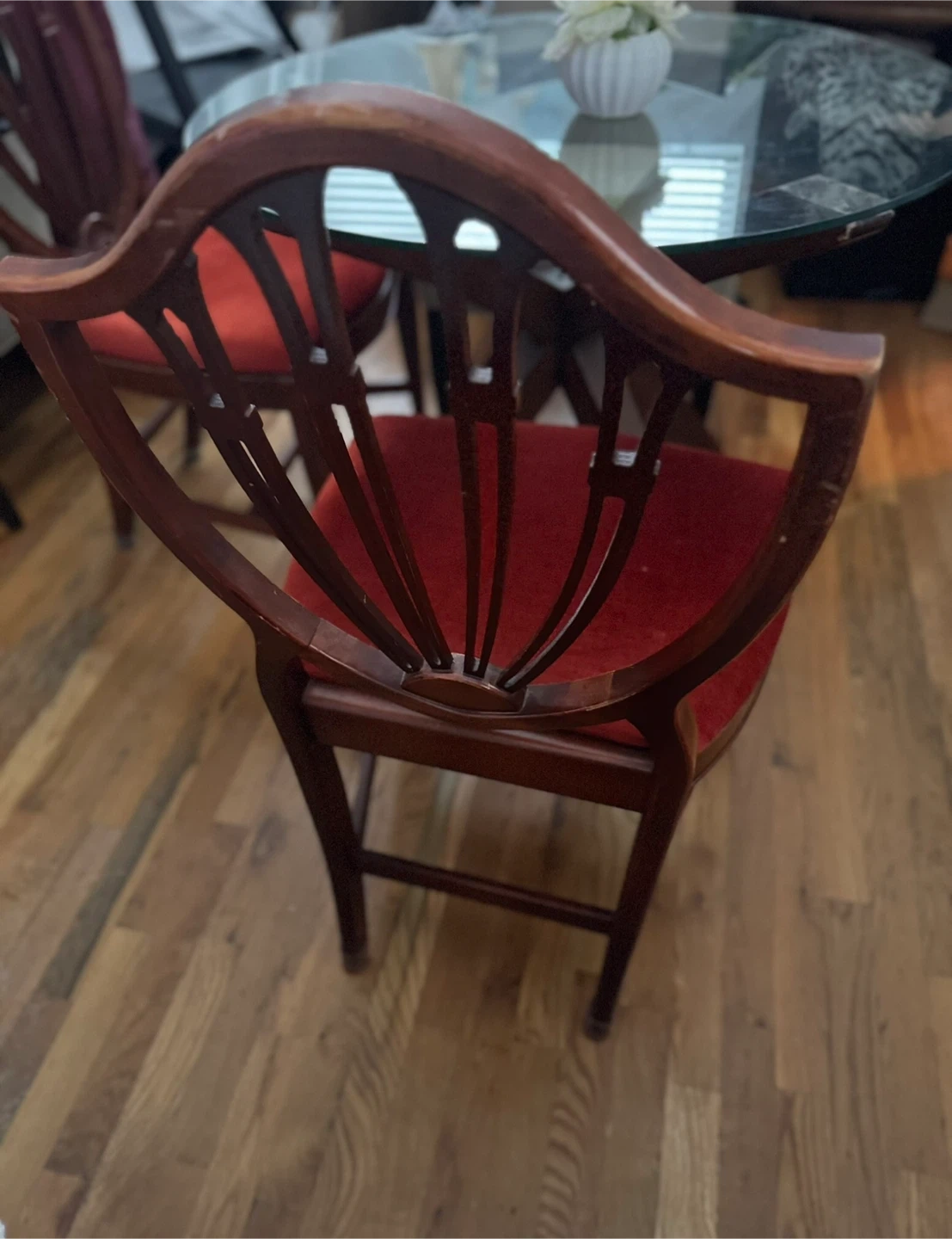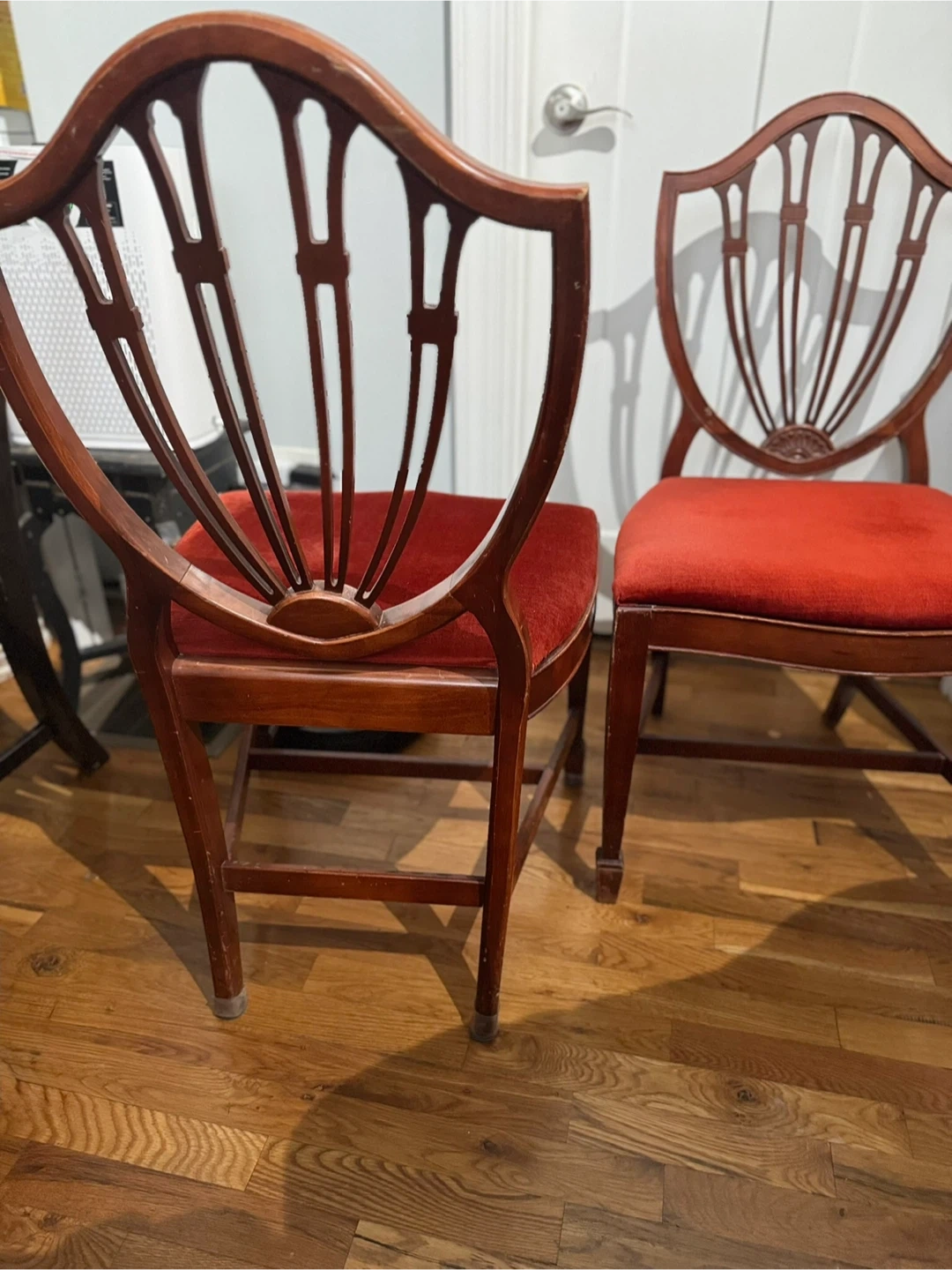 Selling a set of two antique dining chairs. They feature a beautiful red velvet seat and a unique shield back design. The chairs are made of wood and would add a touch of elegance to any dining room