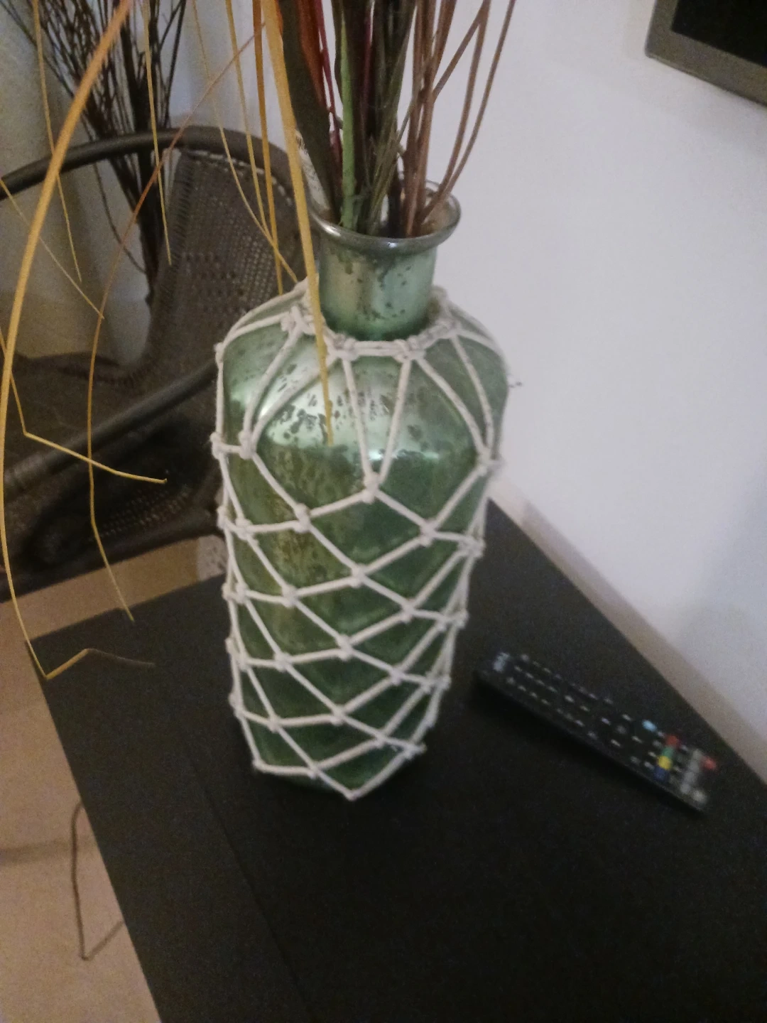 A cute green glass vase with a decorative rope netting around it. Perfect for displaying your favourite flowers or plants! It's in great condition and would look lovely in any room of your home