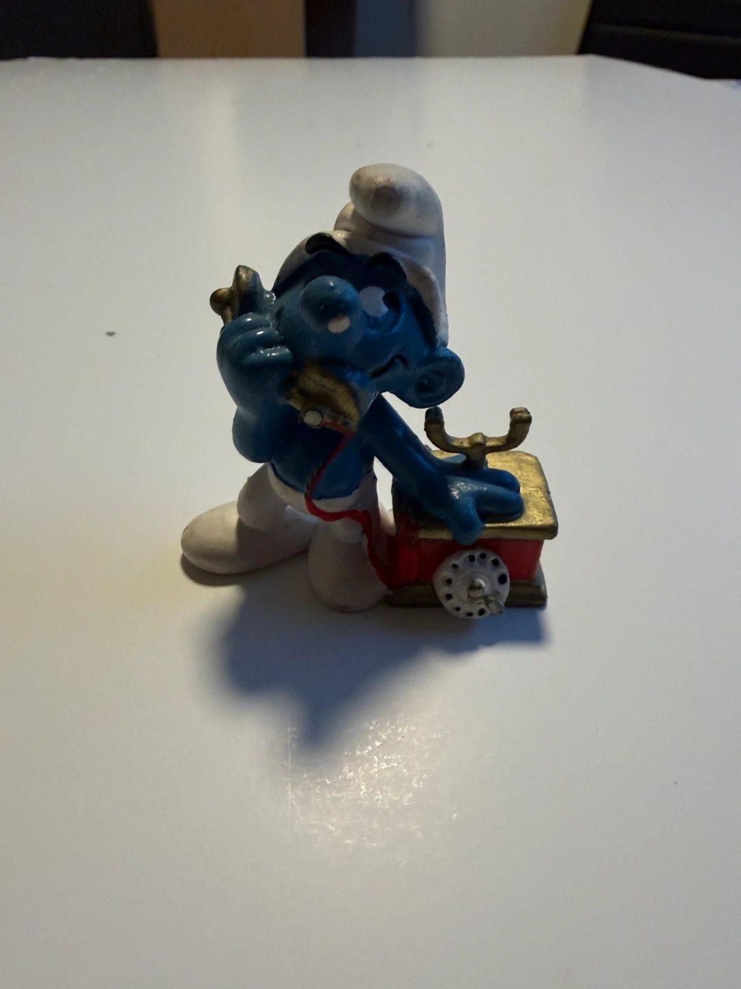 Selling a cute Smurf figurine! It features a Smurf character with a telephone. It's in good condition and would make a great addition to any collection