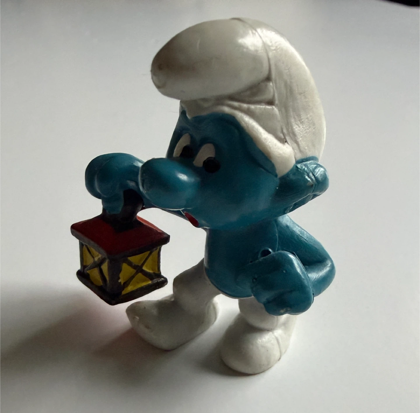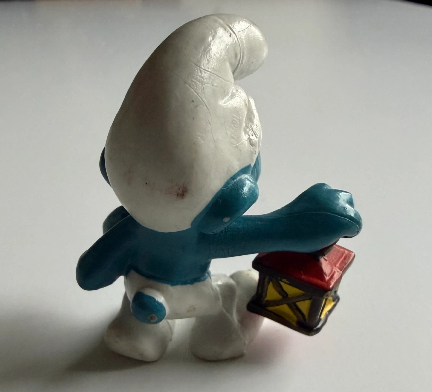 Selling a vintage Smurf figurine holding a lantern. It's in good condition for its age, with some minor wear and tear. A charming collectible for any Smurfs fan!