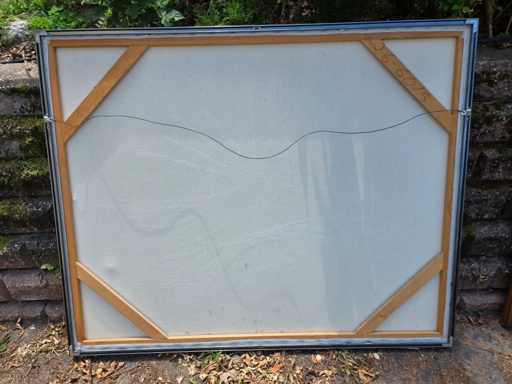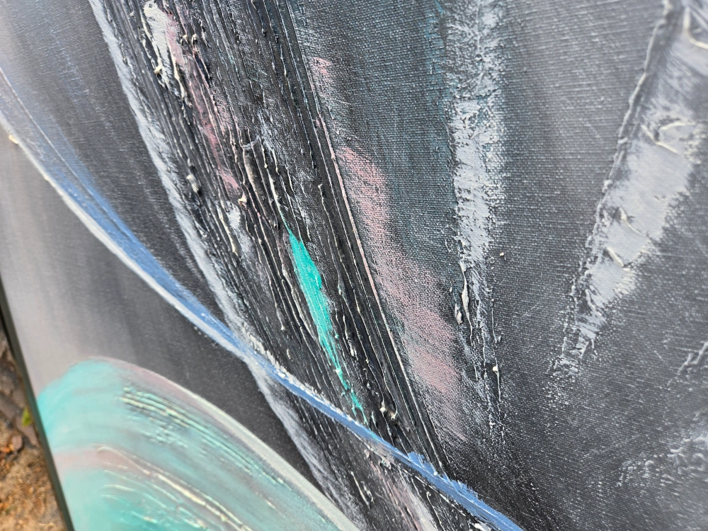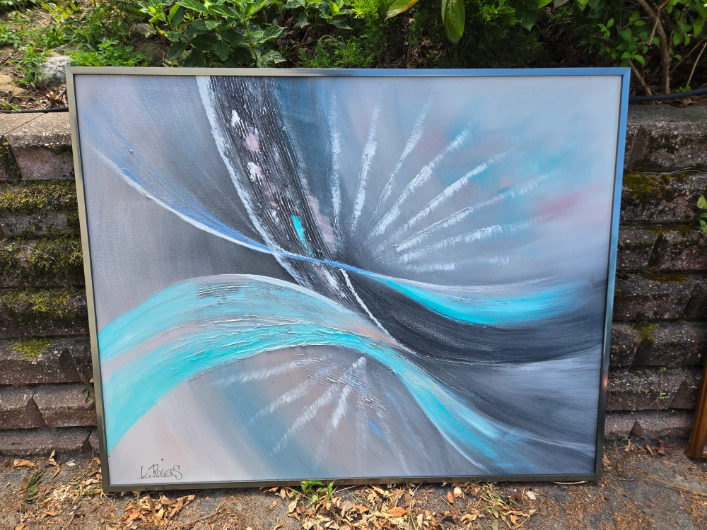 Selling an abstract painting signed by L. Rogers. It features beautiful shades of gray, black, and turquoise. The painting is framed with metal and ready to hang!