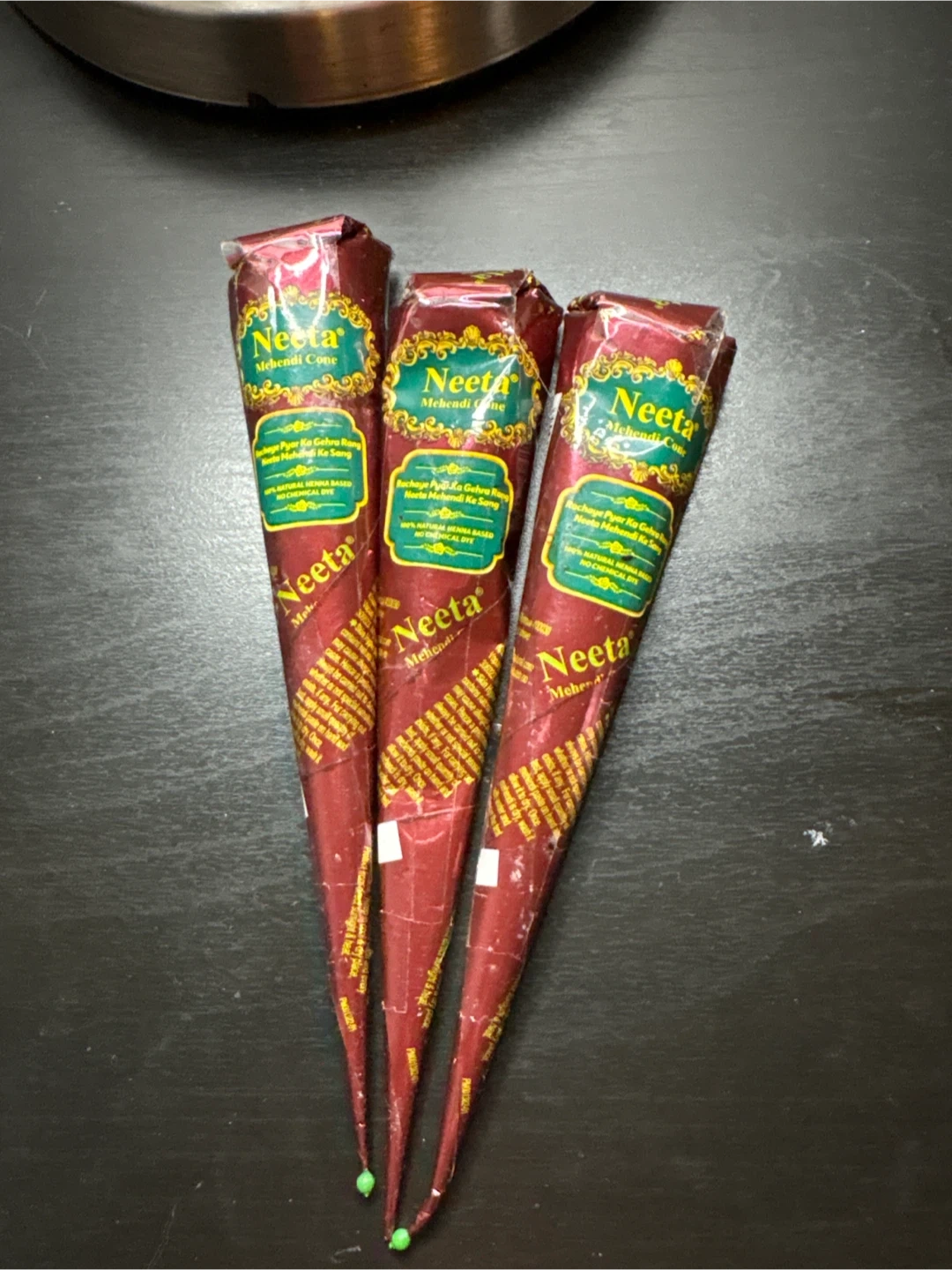 Three Neeta Mehendi Cones! These cones are 100% natural henna based and have no chemical dye. Perfect for creating beautiful henna designs!