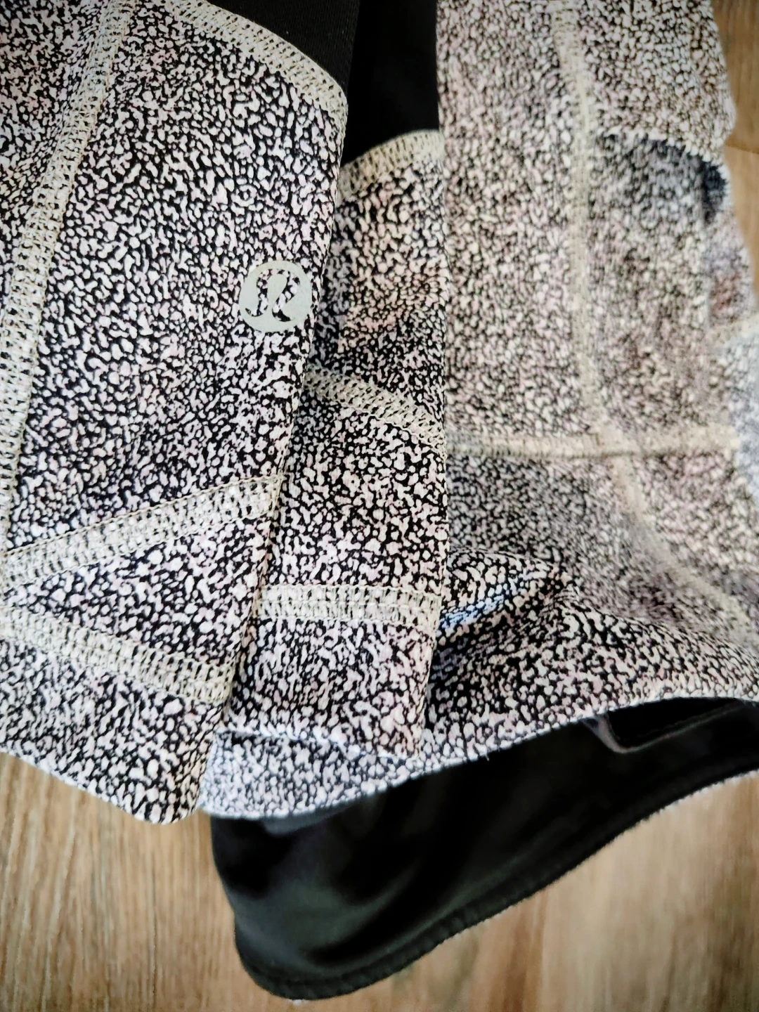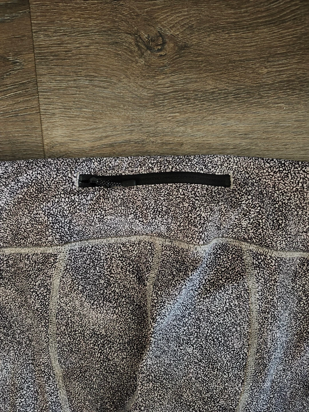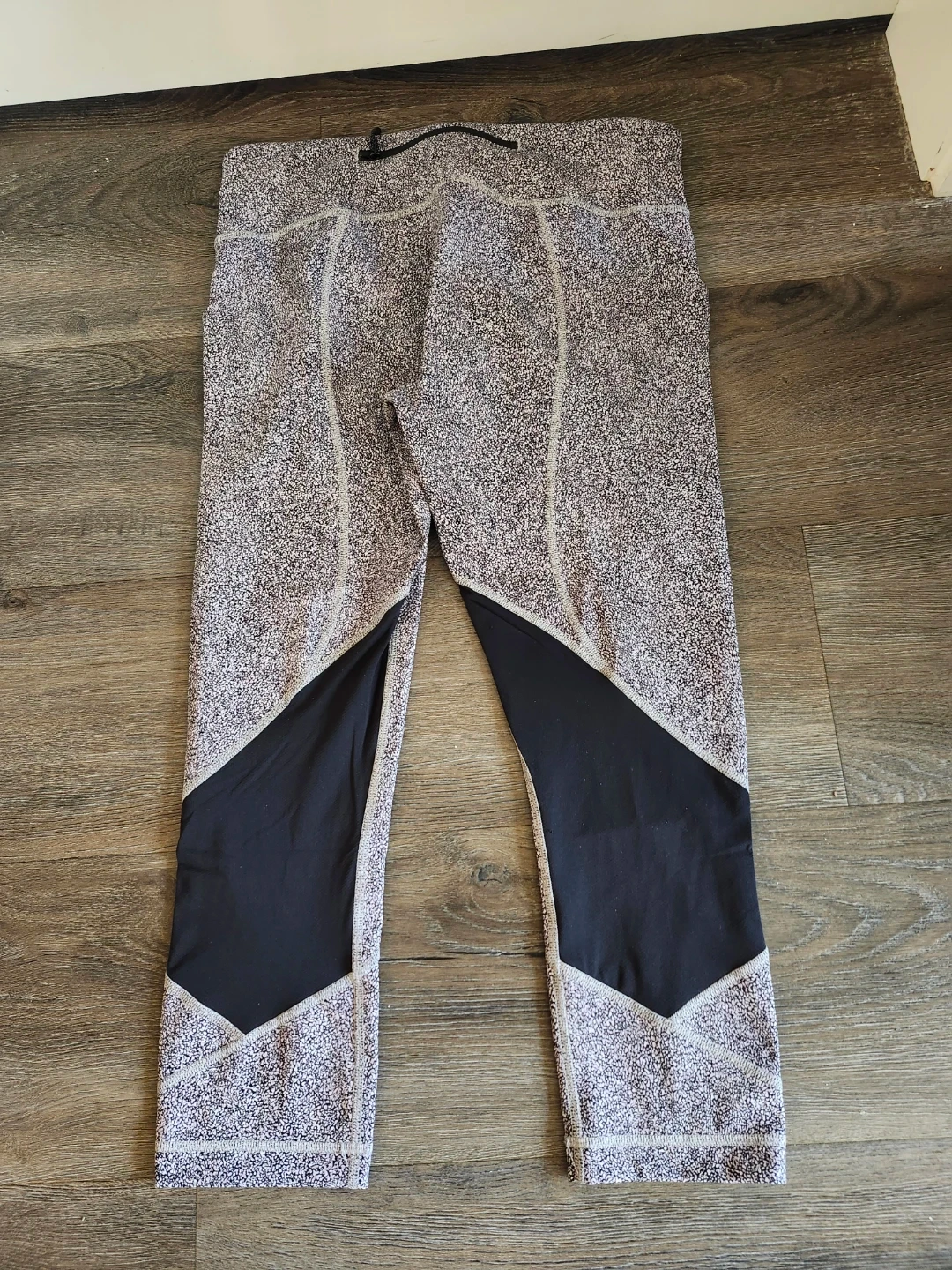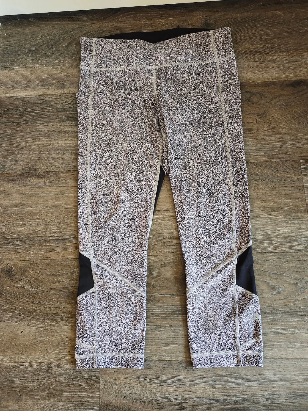 Selling a pair of Lululemon capri leggings. They feature a unique speckled pattern and black accents. Small zippered back pocket. Great for workouts or everyday wear!