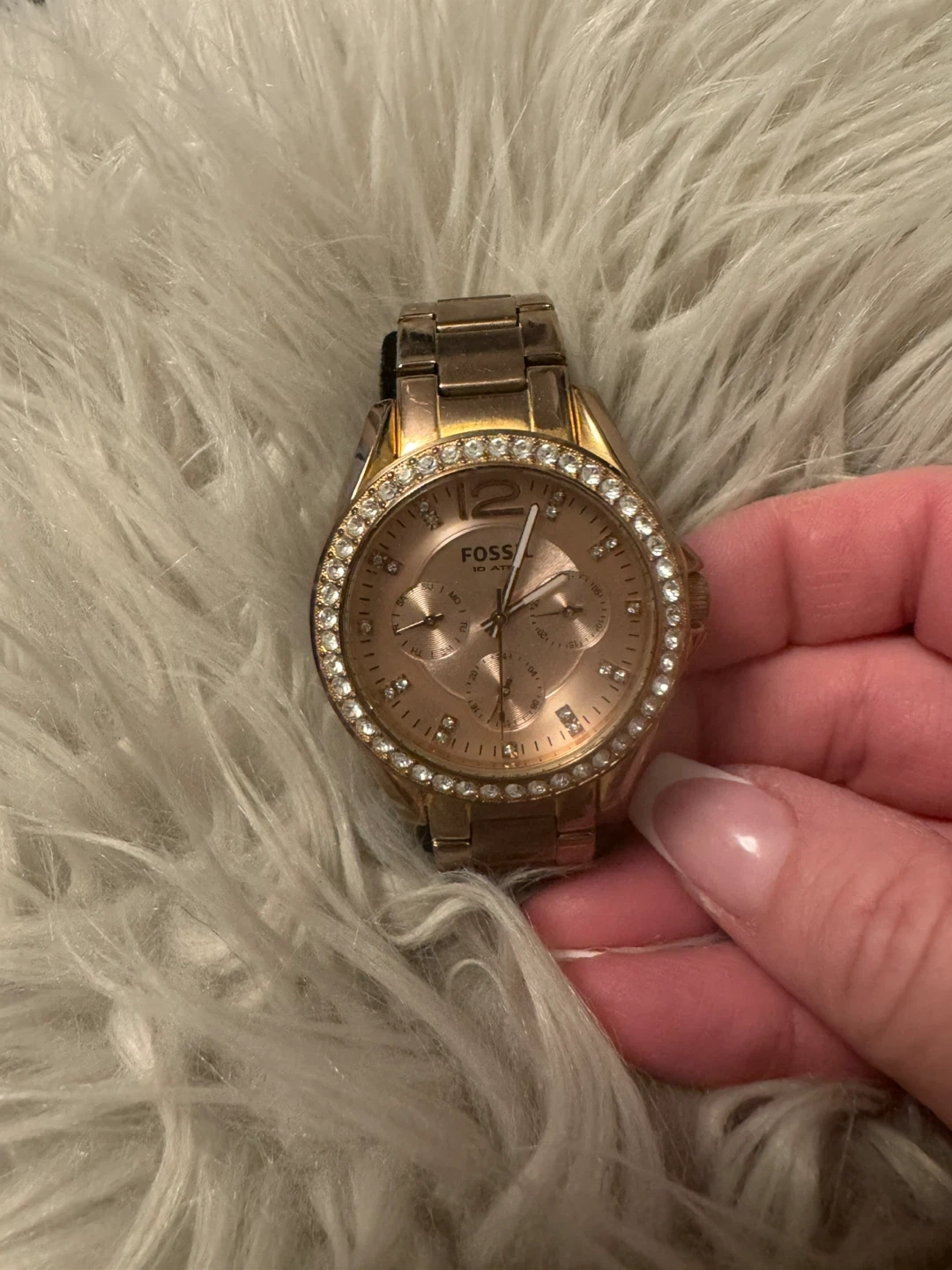 Selling a lovely Fossil ladies' watch. It has a gold tone and a sparkly bezel. It's in great condition! Needs a new battery