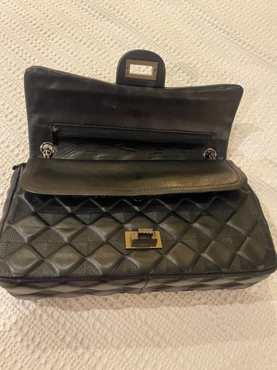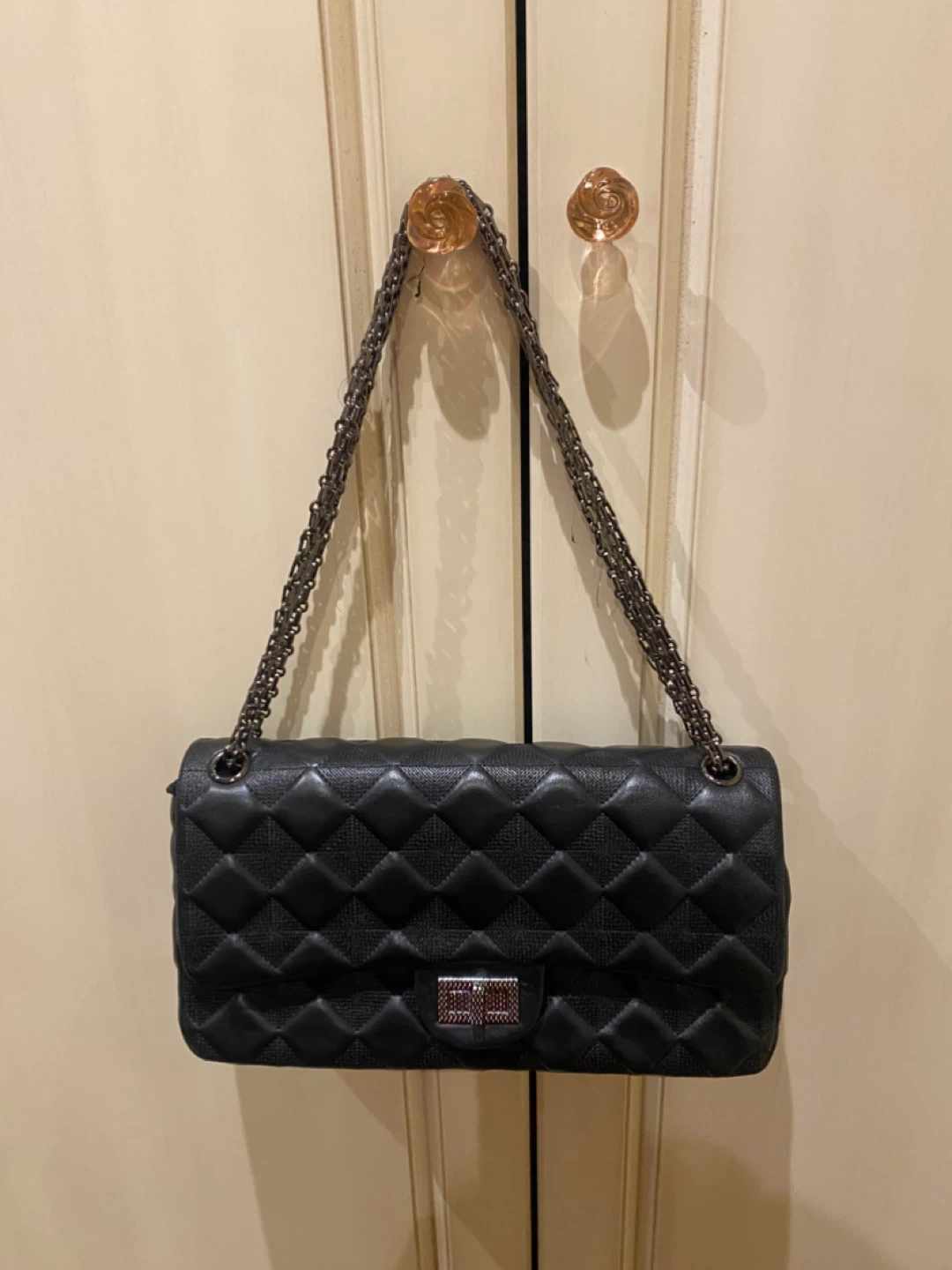 Selling a stylish handbag in black quilted leather. It features a chain strap and a classic design.