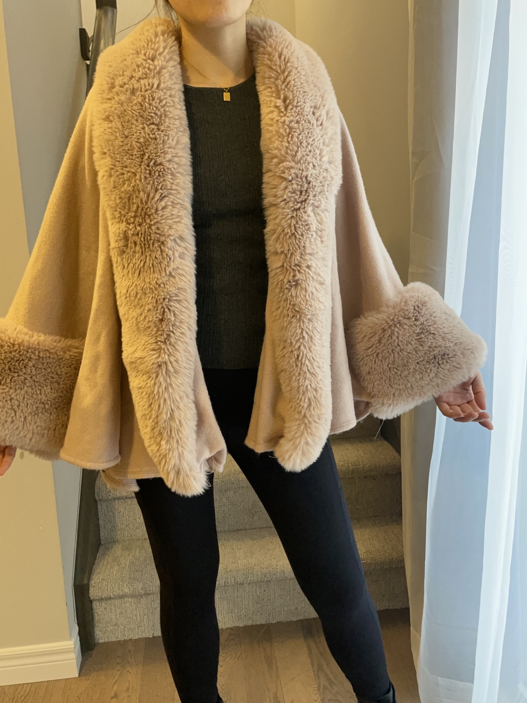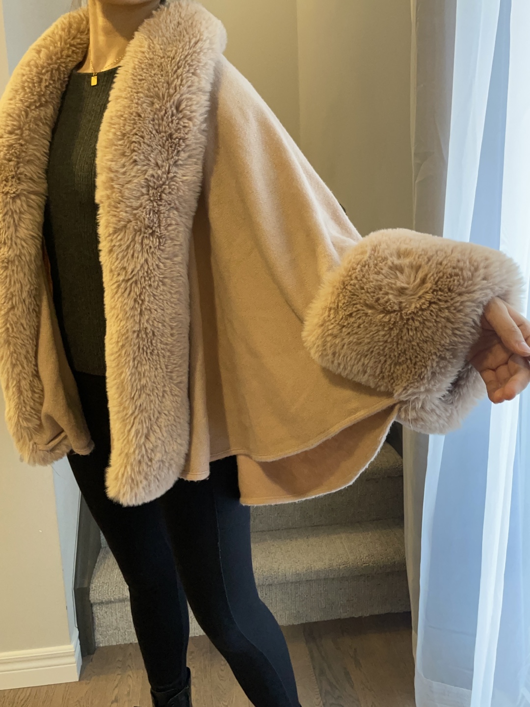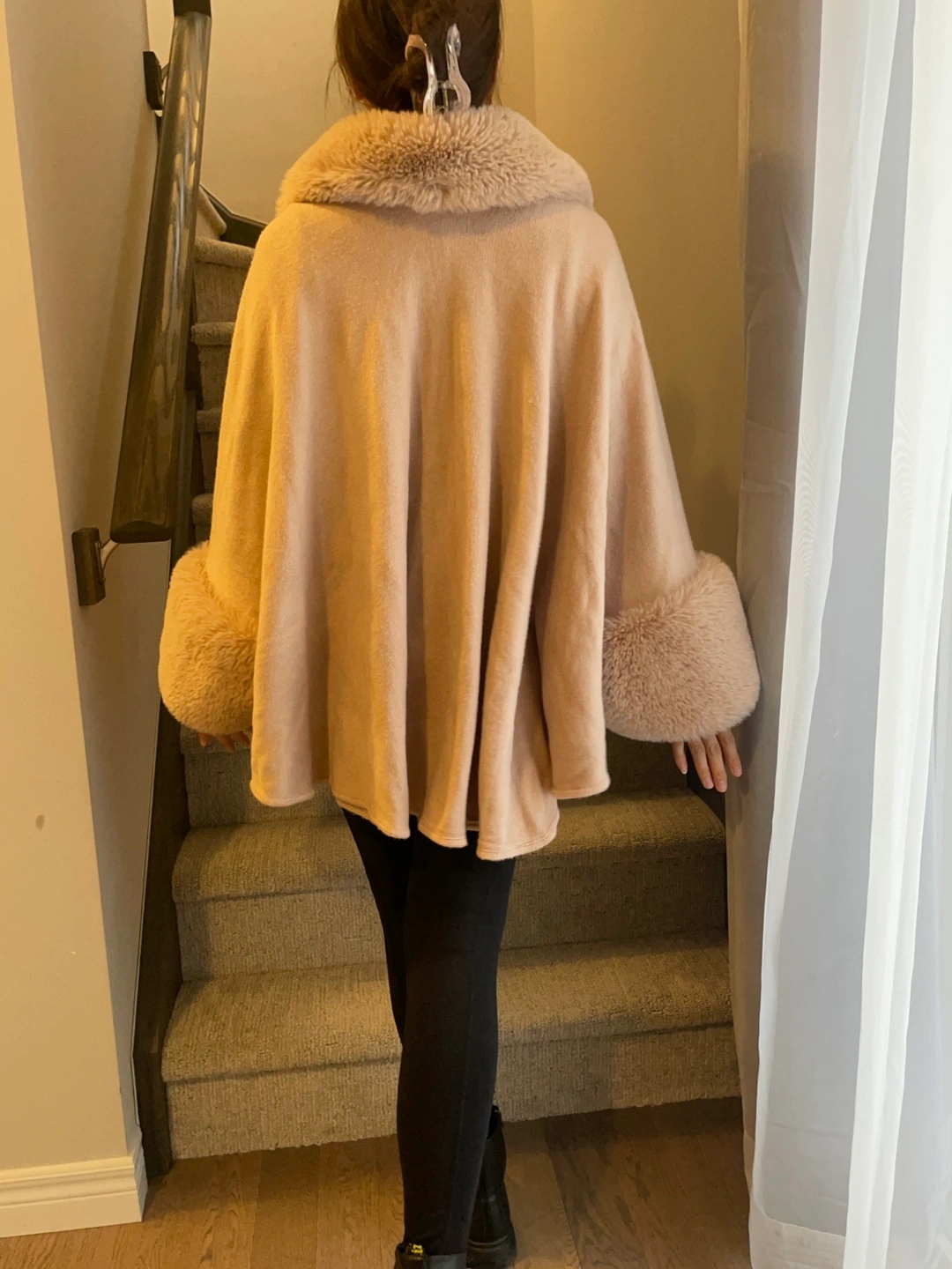 Selling a stylish cape with a faux fur trim! It's a beautiful beige colour and would be perfect for layering during the cooler months. It adds a touch of elegance to any outfit!