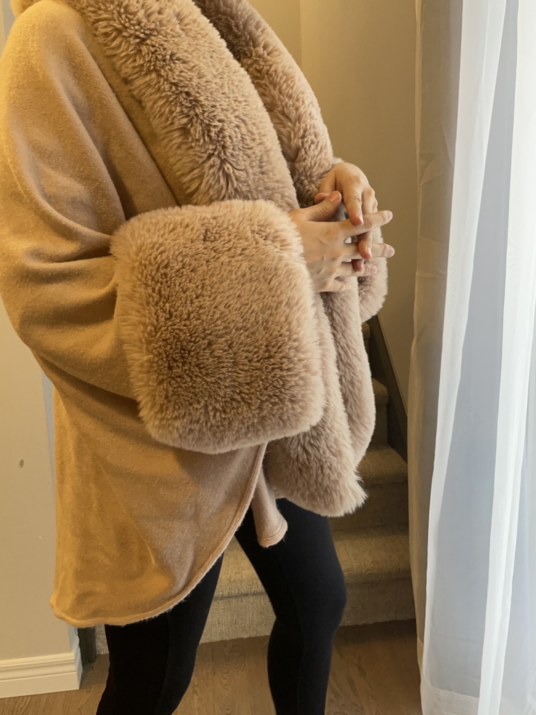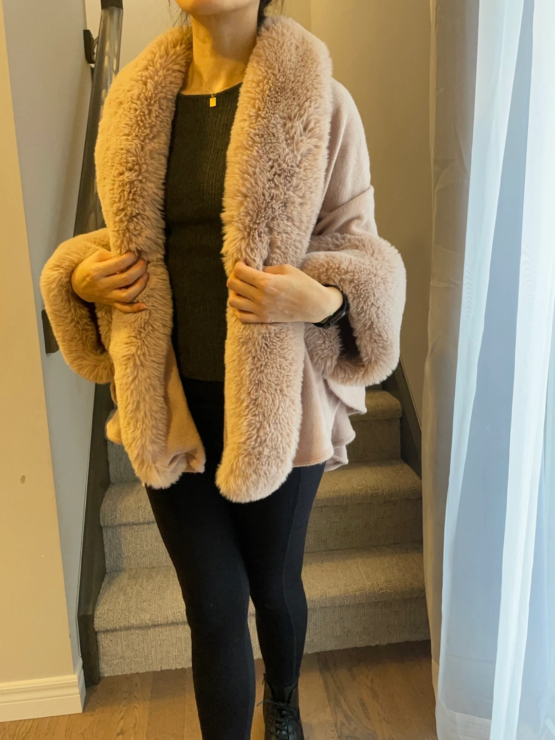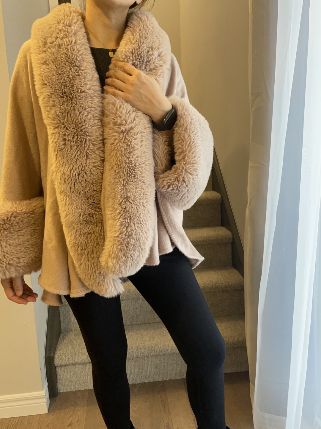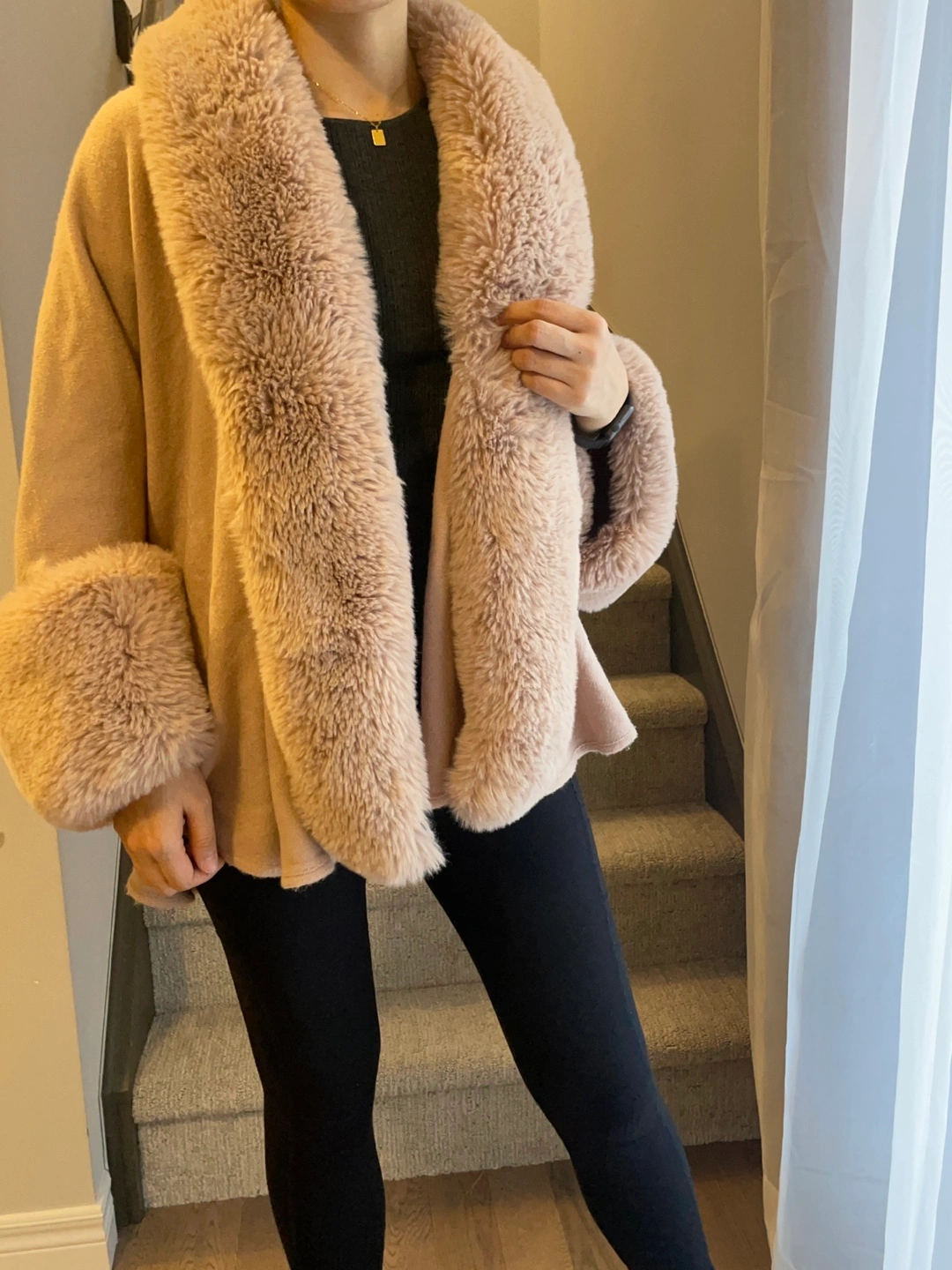 Selling a stylish cape with a faux fur trim! It's a beautiful beige colour and would be perfect for layering during the cooler months. It adds a touch of elegance to any outfit!