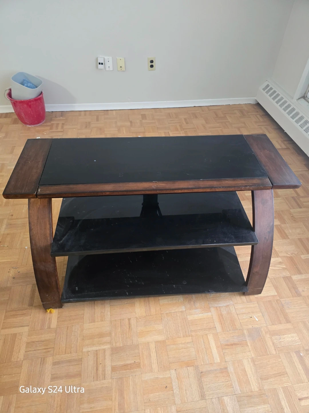Selling a TV stand with a black glass top and a wooden frame. It features two shelves for storage. The stand is in good condition and would be a great addition to any living room