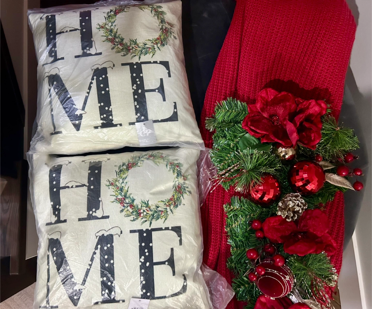 Brand new CF “HOME” pillows in farmhouse holiday style.