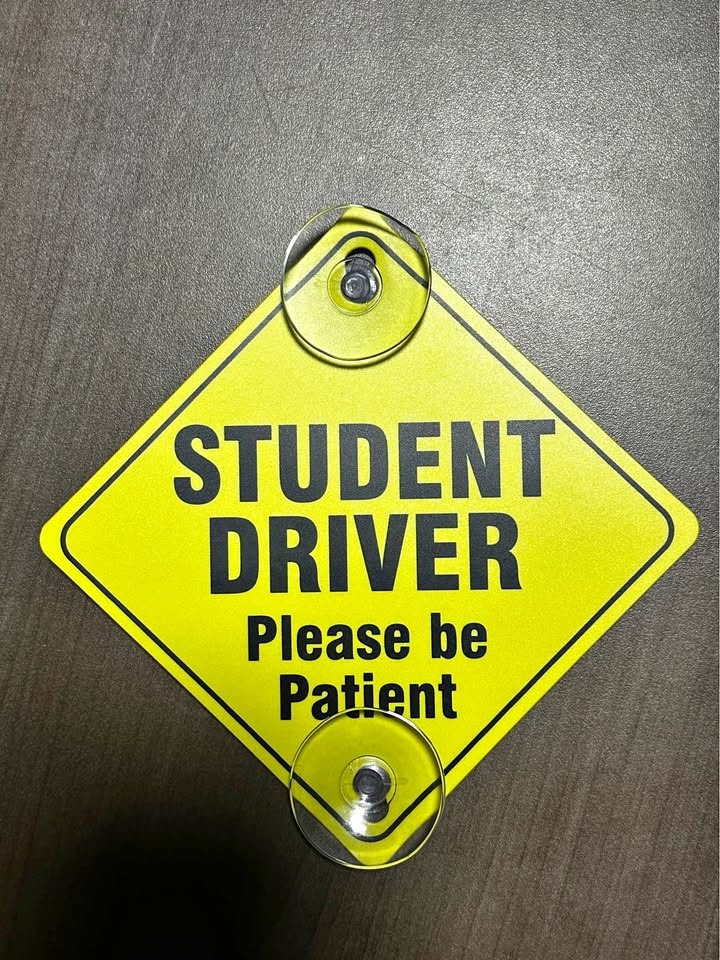 Yellow diamond-shaped sign with black text that reads 'STUDENT DRIVER Please be Patient'. Has two suction cups on the back for attachment to a window.