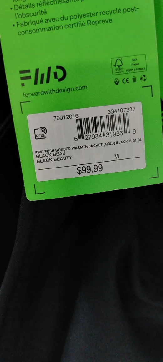 Selling a FWD Push Bonded Warmth Jacket in black, size medium. It's a stylish and comfortable jacket that's perfect for staying warm. Original price $99.99!
