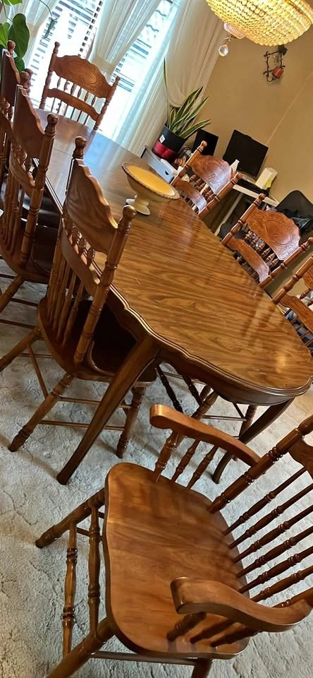 Chairs are in excellent condition the table very well kept with little scratches here and there and some wear and tear but amazing condition  2 chairs have arms Length 94 inches (with 3 leaves) Shortest length 58 inches Width 42 inches.