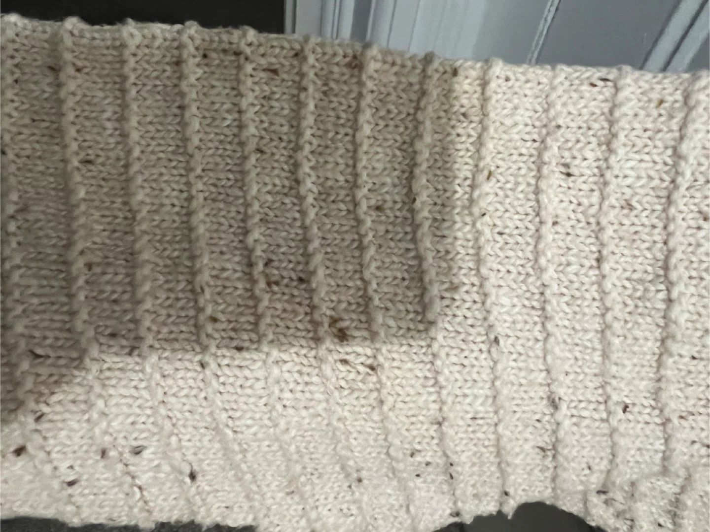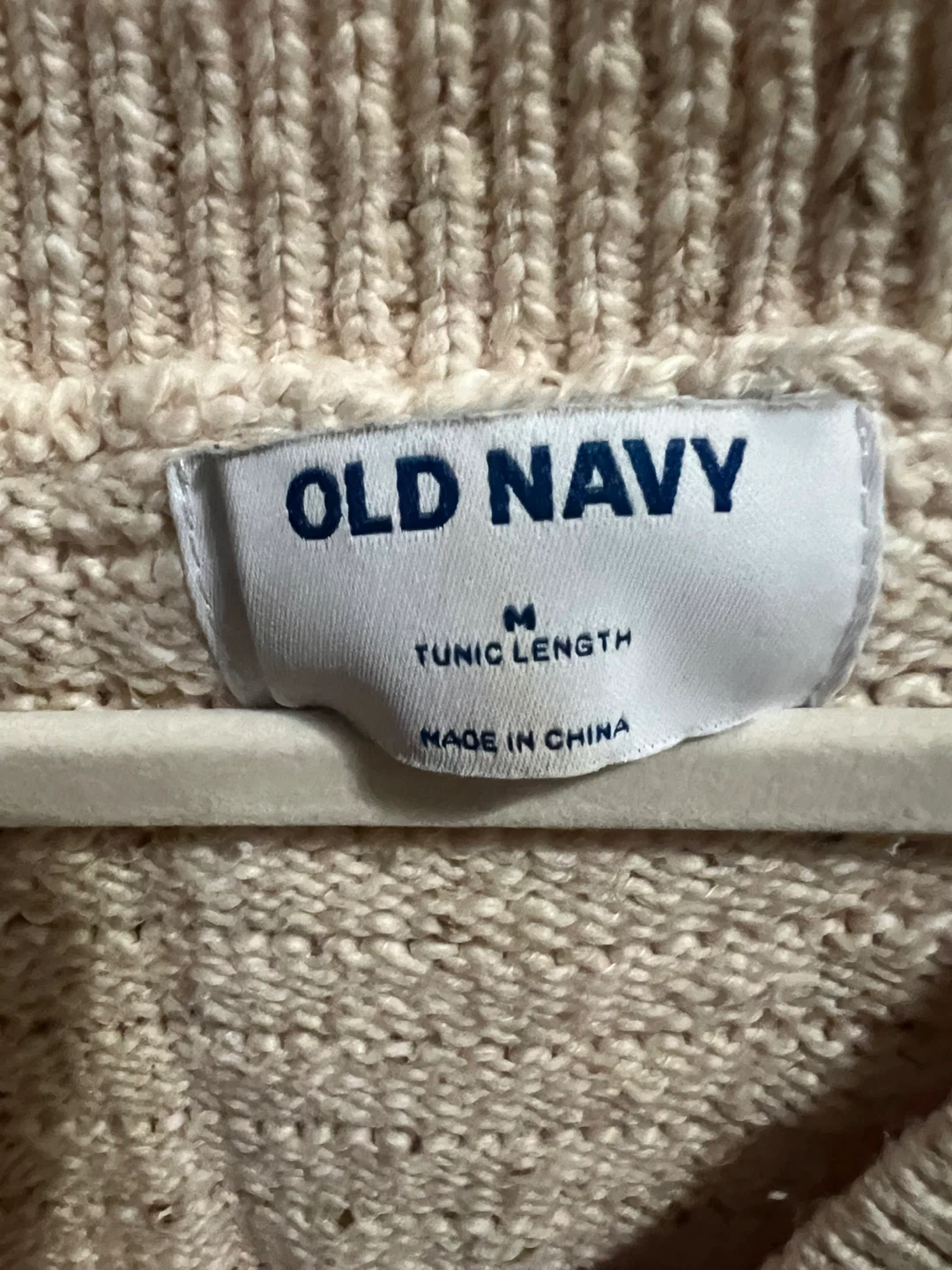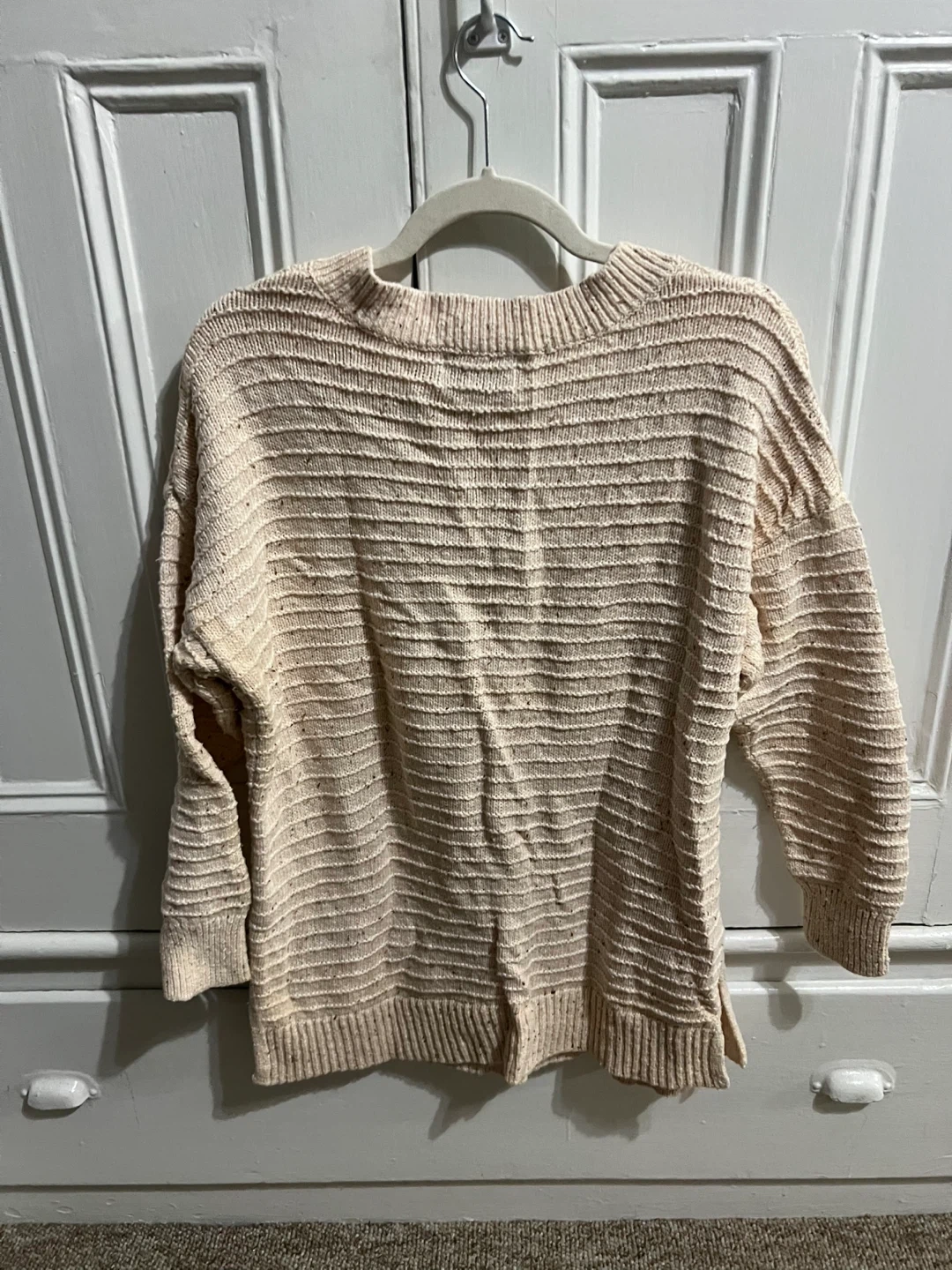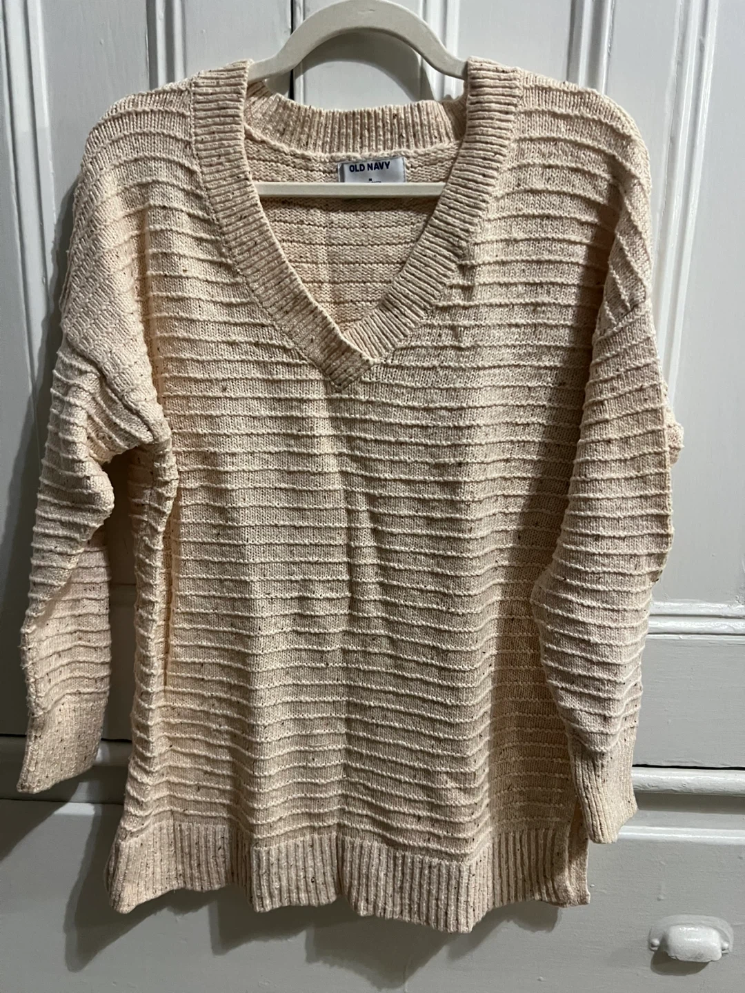 Selling a cute 100% cotton Old Navy sweater in a size medium! It's a tunic length with a v-neck. It's a light cream color with horizontal ribbed texture. Perfect for layering! Wrinkled from being folded in a draw since last winter but clean and from a smoke free and pet free home.