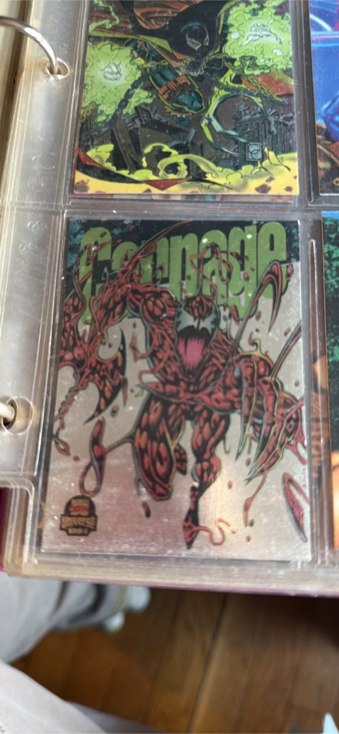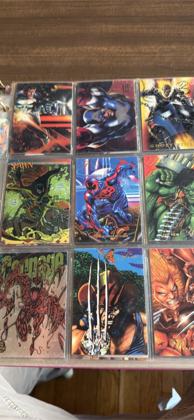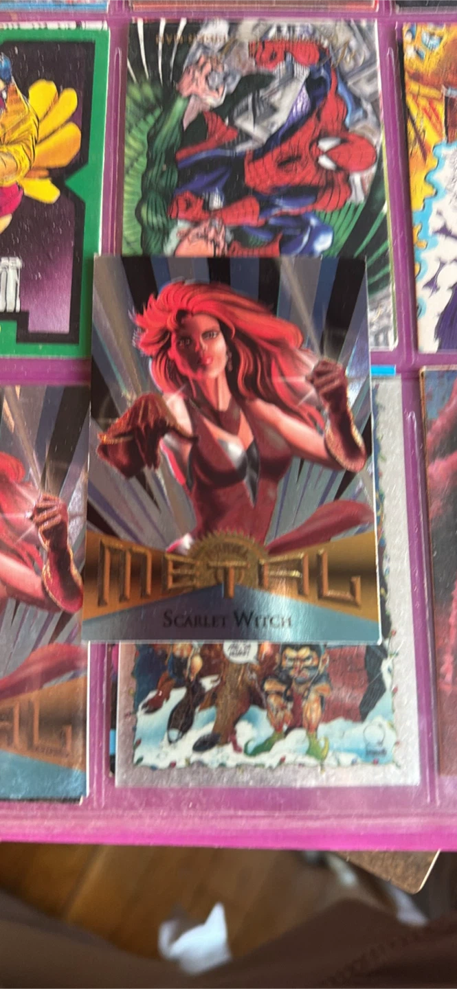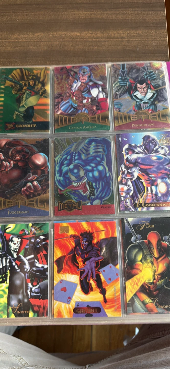 Selling a collection of Marvel Metal trading cards featuring characters like Gambit, Captain America, Punisher 2099, Juggernaut, Venom, Moon Knight, Sinister, Deadpool, Spawn, Spider-Man, Hulk, Carnage, and Scarlet Witch. Great for any Marvel fan or collector!