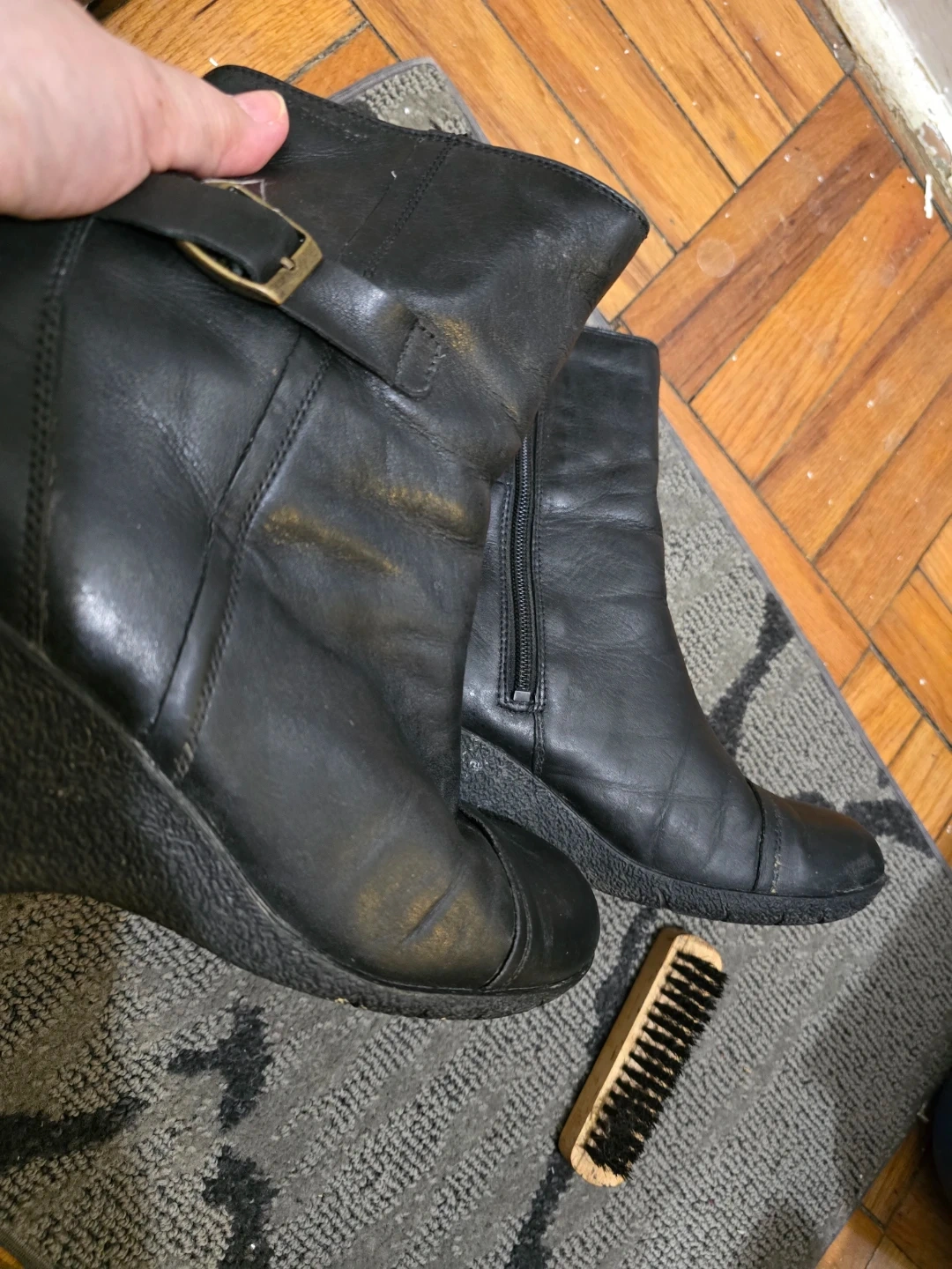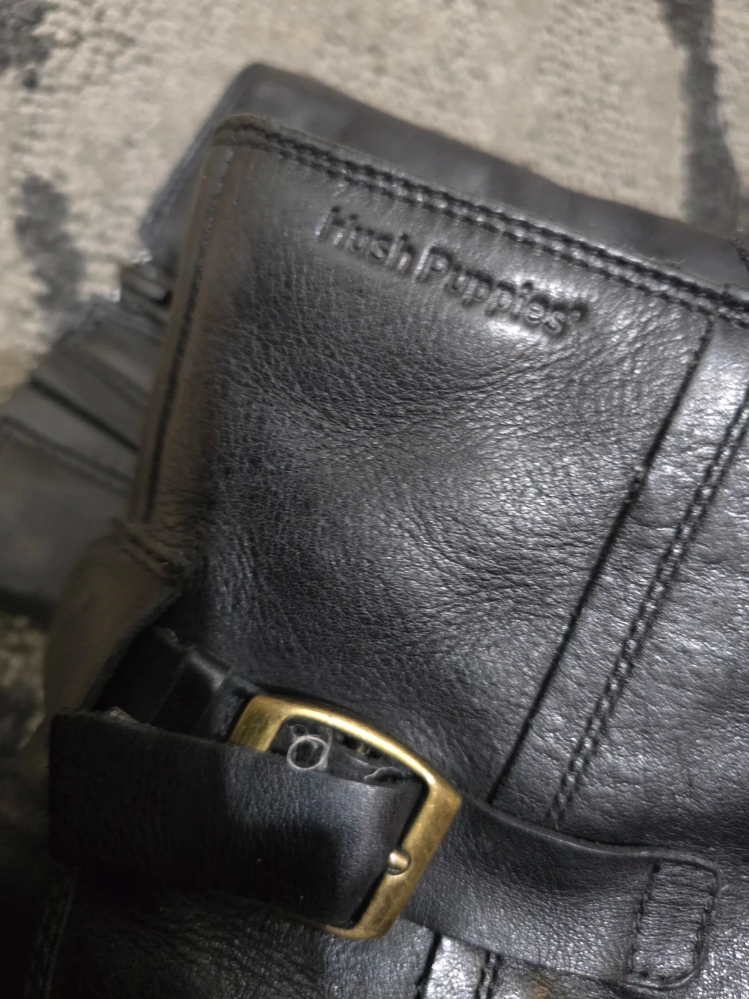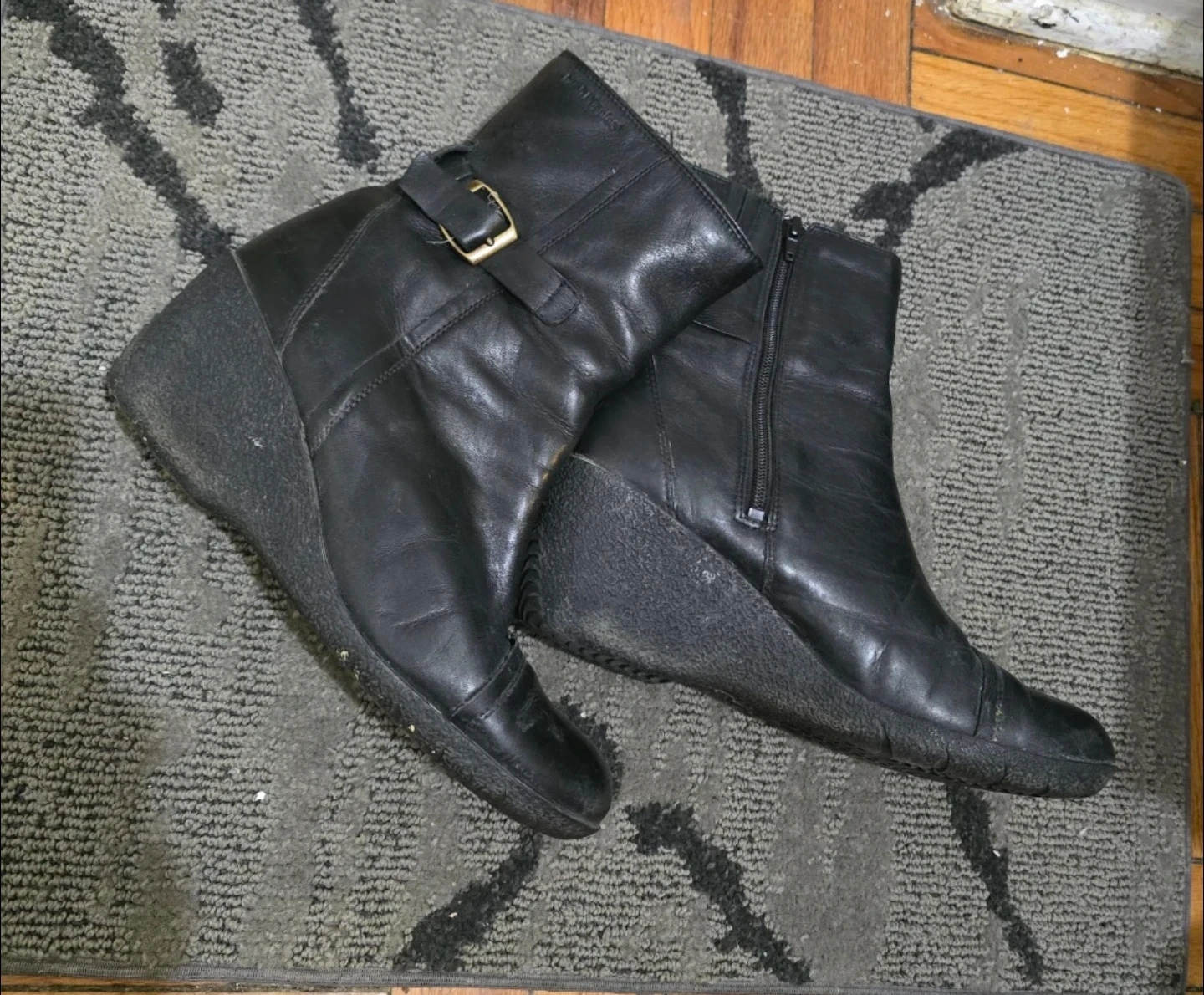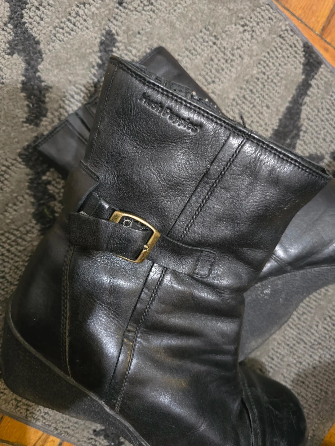 Selling a pair of Hush Puppies black leather wedge boots. They show some signs of wear, but still have lots of life left in them! Perfect for adding a bit of height and style to your outfits.