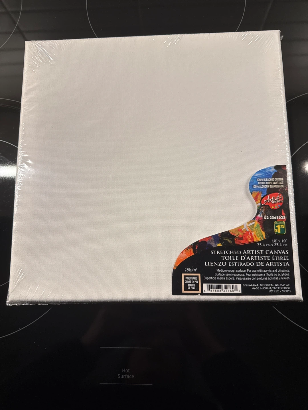Selling a brand new Artist's Series stretched canvas, still in its original packaging! It's a 10" x 10" canvas with a medium-rough surface, perfect for acrylic and oil paints. The canvas is 280g/m² and has a pine frame. Originally bought for $1.75