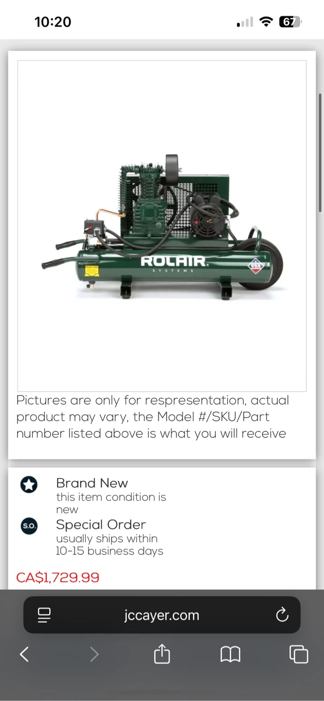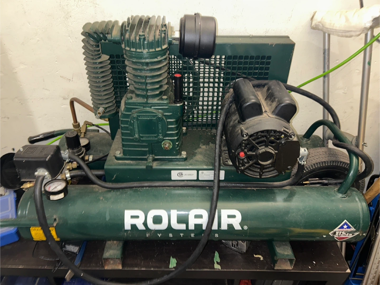 I'm selling a brand new Rolair 5715K17 Rolair 1.5-HP 9-Gallon Electric Dual Voltage Wheelbarrow Air Compressor (115-230V 1-Phase). The model number is 5715K17DC338RG. Retails for $1,729.99! Asking 750$ obo