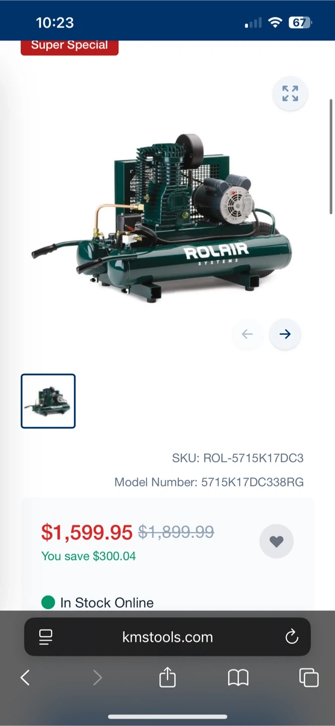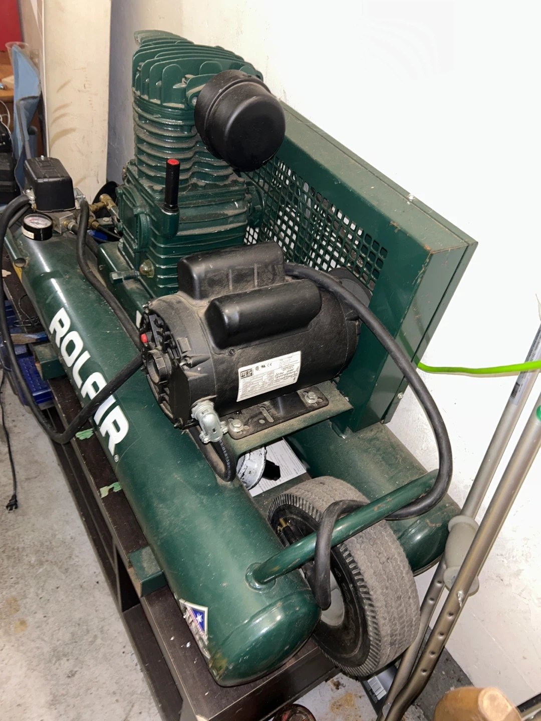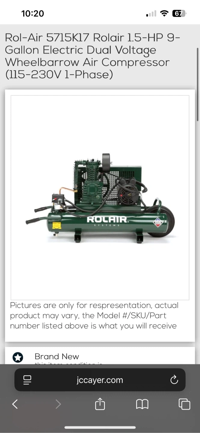 I'm selling a brand new Rolair 5715K17 Rolair 1.5-HP 9-Gallon Electric Dual Voltage Wheelbarrow Air Compressor (115-230V 1-Phase). The model number is 5715K17DC338RG. Retails for $1,729.99! Asking 750$ obo