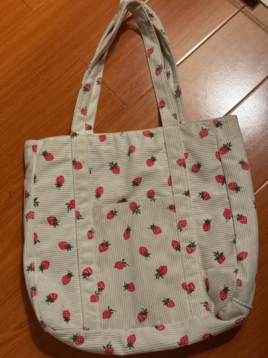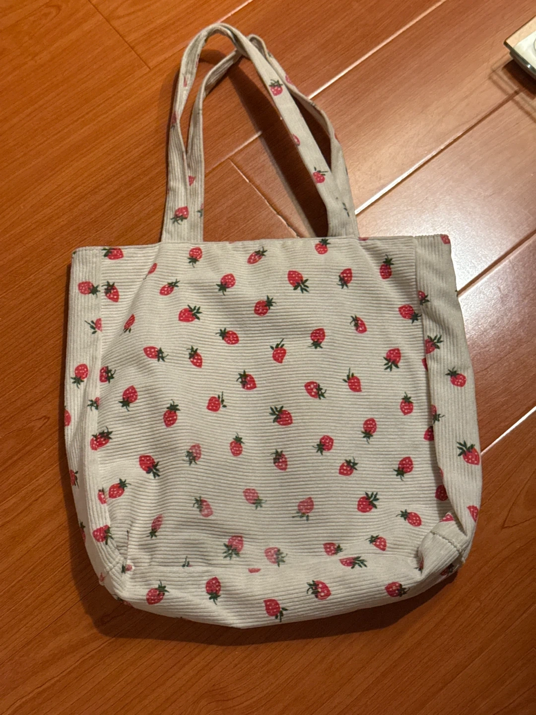 Super cute corduroy tote bag with a strawberry print! Perfect for carrying books or groceries. It's in great condition and ready for a new owner