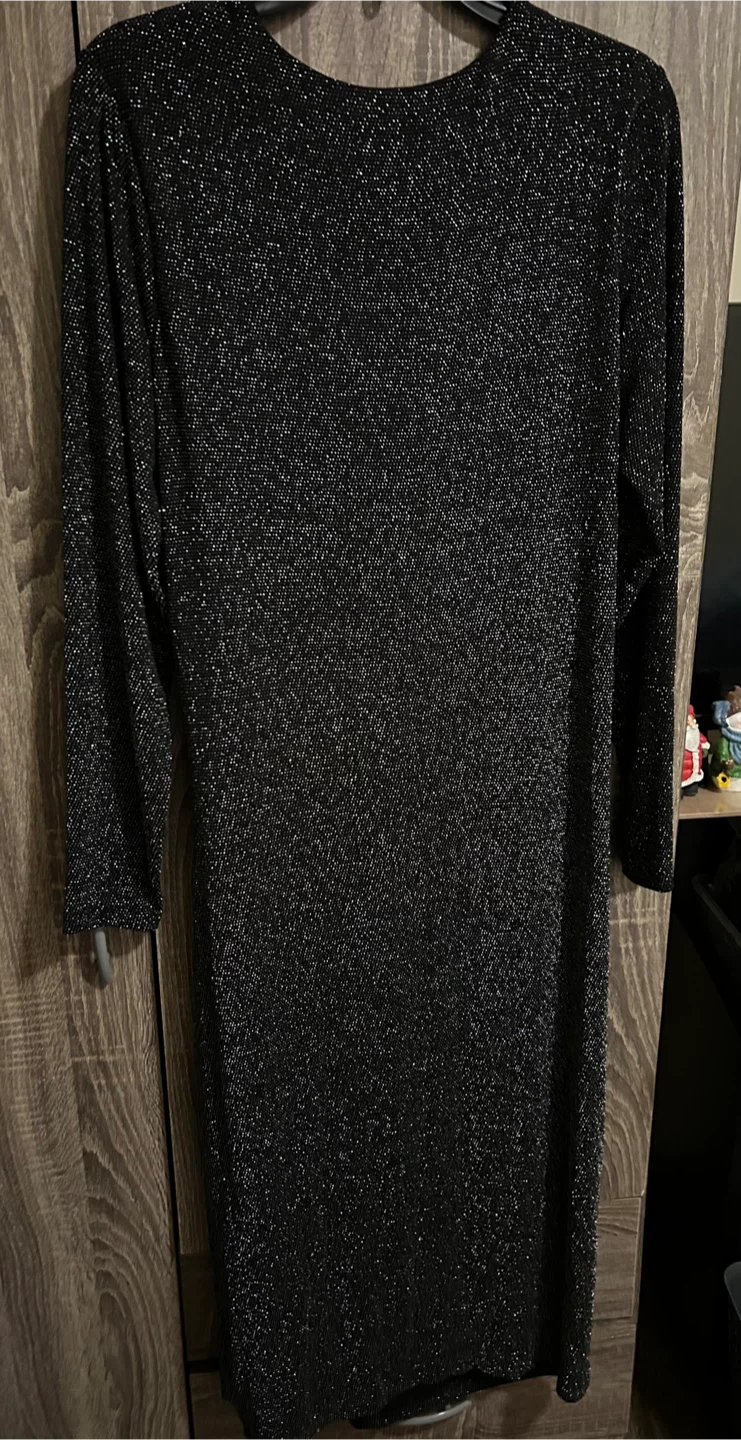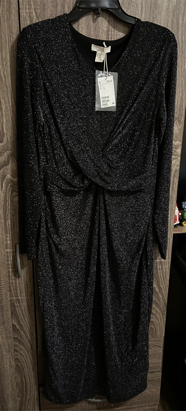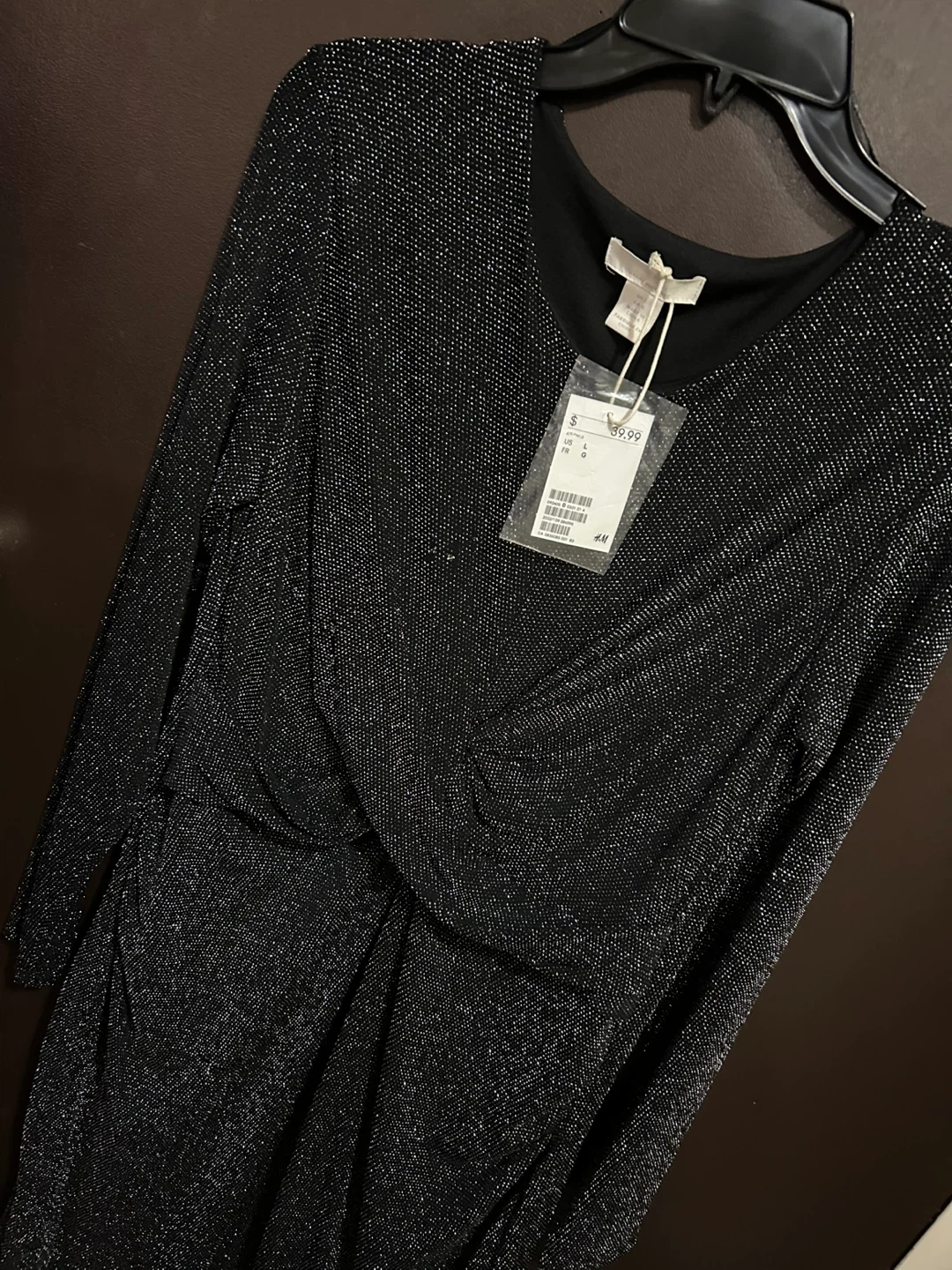Selling a Brand new H&M black sparkly dress in size Large. It has a stylish twist detail at the front and long sleeves. Originally bought for $39.99!
