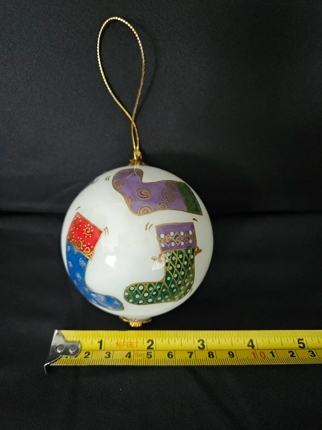 Christmas "stockings" glass ornament painted from the inside dated 2001. Has never been used. The box shows wear but the ornament is in excellent condition.
