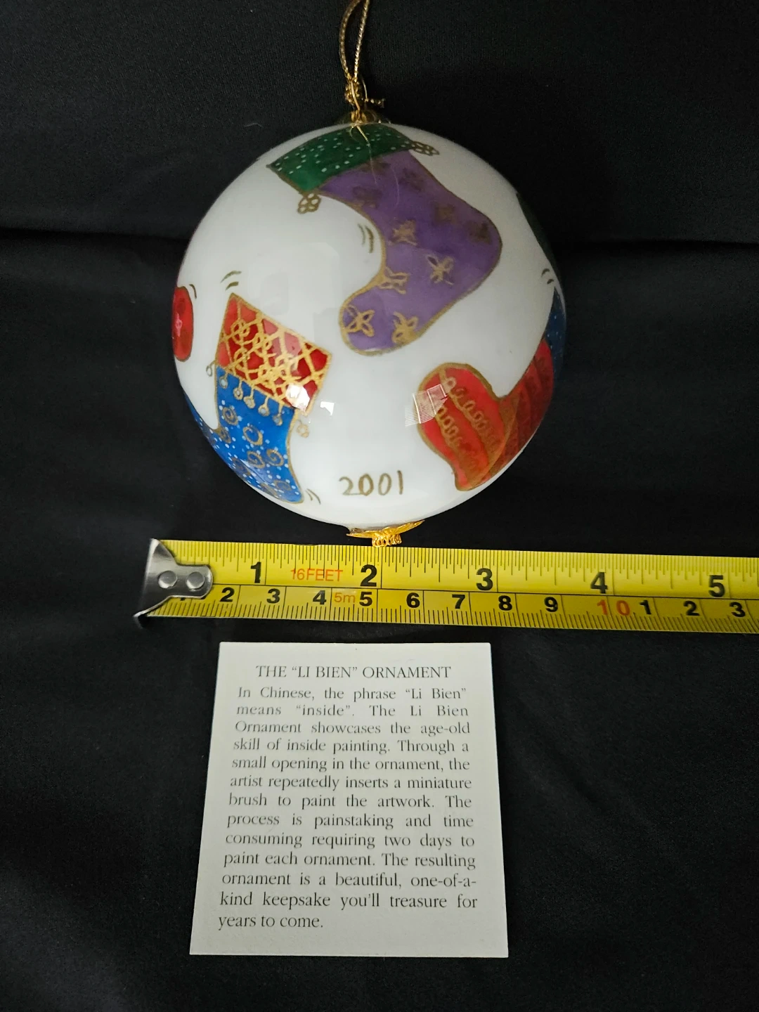 Christmas "stockings" glass ornament painted from the inside dated 2001. Has never been used. The box shows wear but the ornament is in excellent condition.