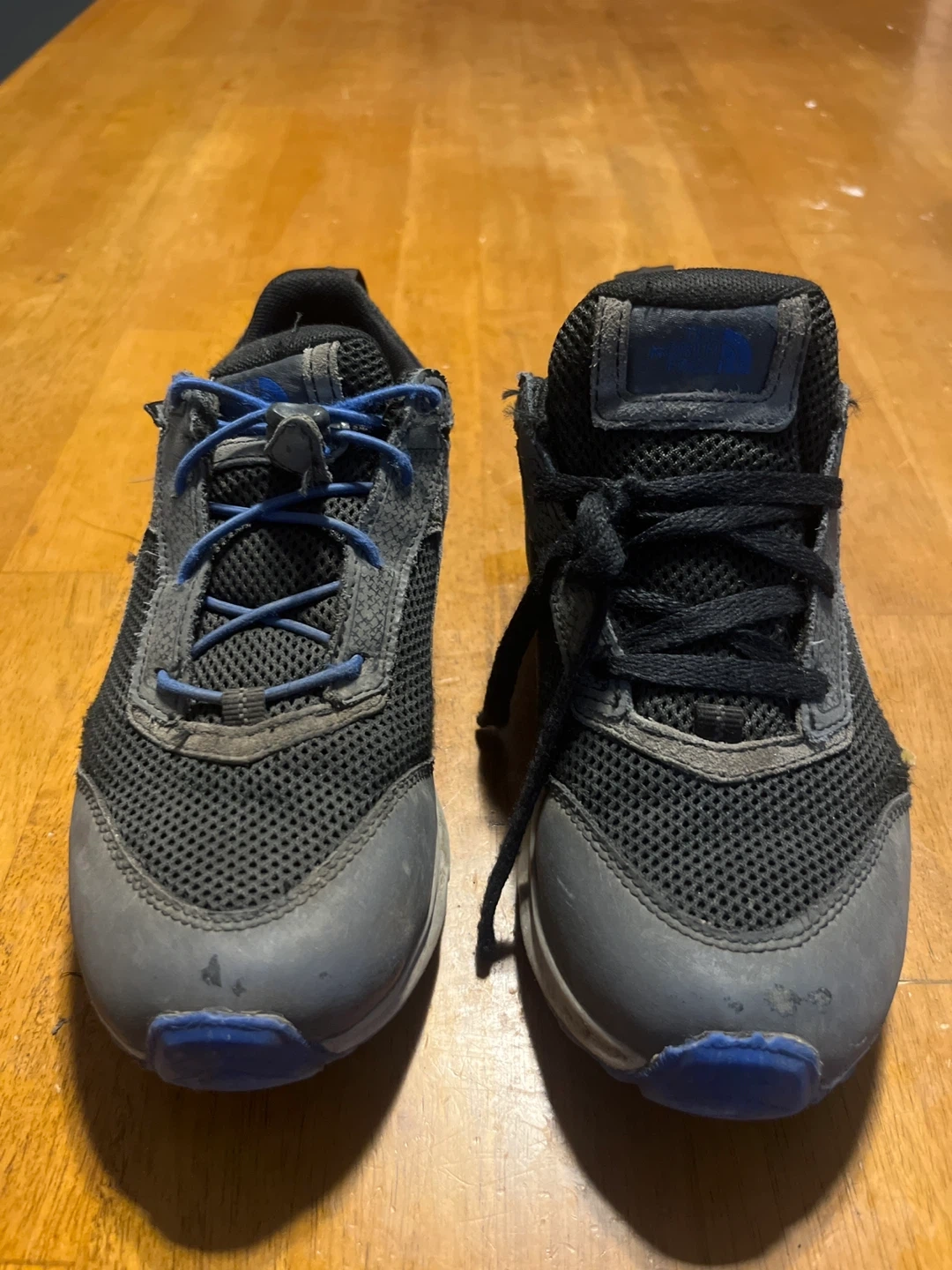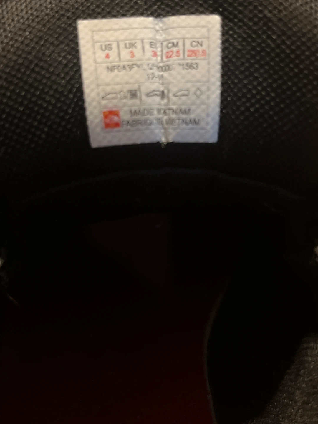 Selling a pair of The North Face kids' hiking shoes in size 4 US. They have a black and grey colour scheme with blue accents. They show some signs of wear but are still in good condition for hitting the trails!