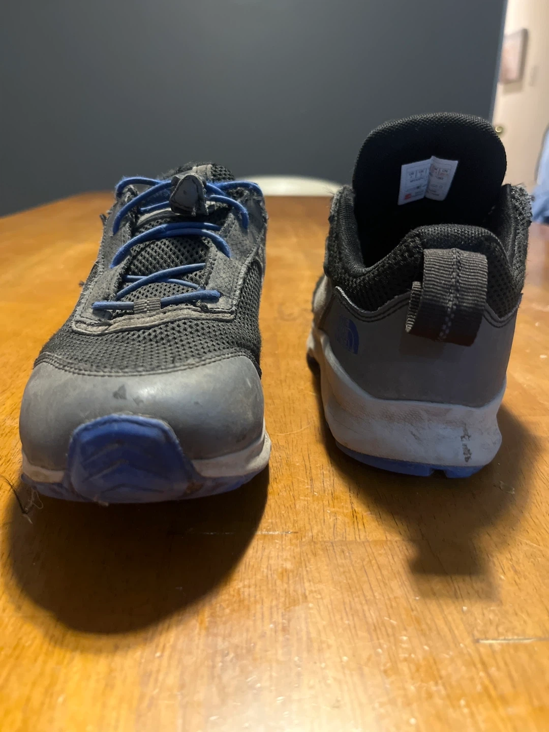 Selling a pair of The North Face kids' hiking shoes in size 4 US. They have a black and grey colour scheme with blue accents. They show some signs of wear but are still in good condition for hitting the trails!
