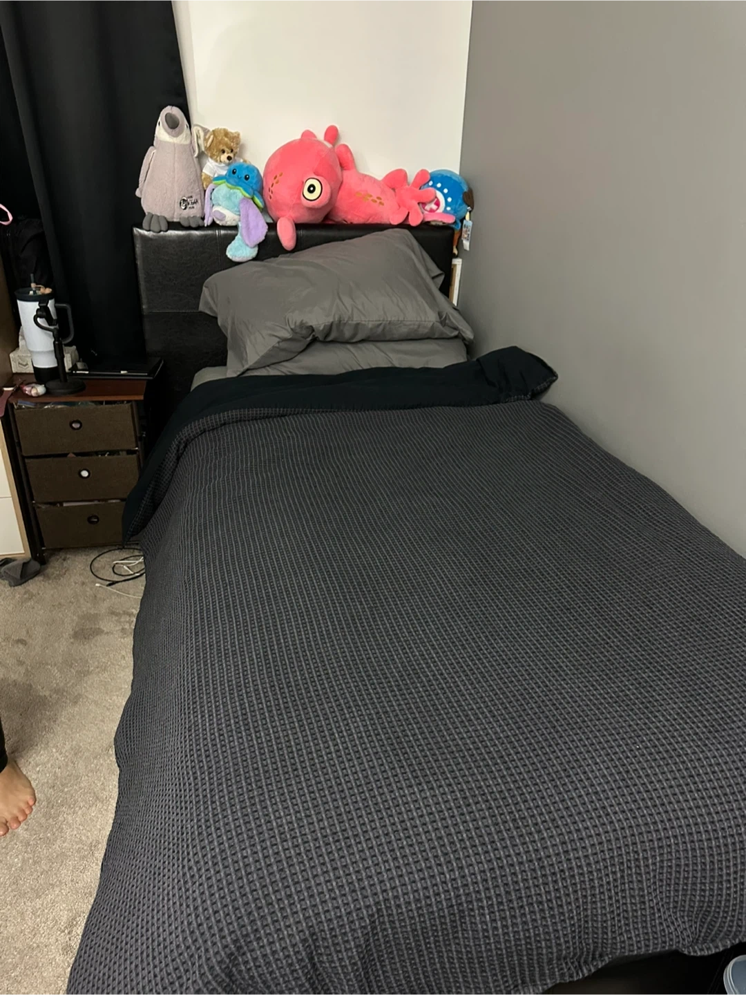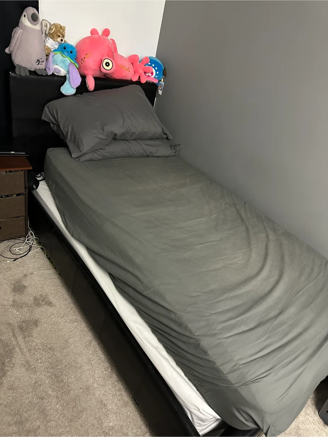 OBO. Selling a single bed frame with a mattress and a box spring. The bed frame is leather-like material and its black. Good condition! Been with me for 2 yrs but I have been travel nursing outside BC so i haven’t really used it a lot. Duvet not included.
