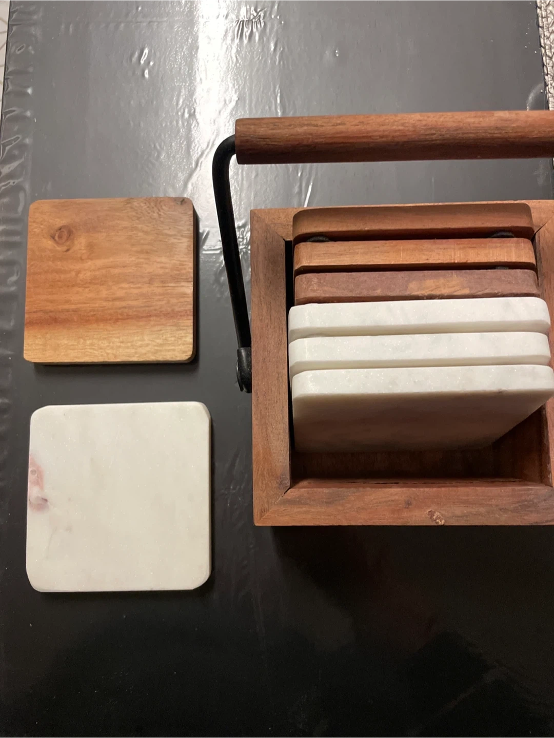 Keep your surfaces protected in style with this lovely coaster set! It features a mix of 4 wood and 4 marble coasters, each with a unique grain and pattern. The set comes with a handy wooden holder for easy storage and display.