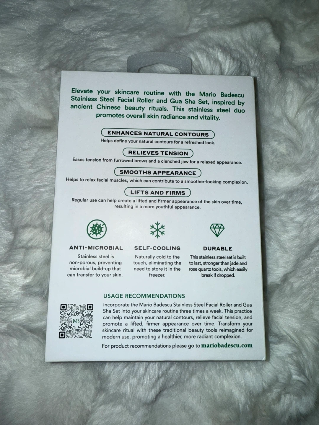 Elevate your skincare routine with this Mario Badescu Stainless Steel Facial Roller and Gua Sha Set! This set is inspired by ancient Chinese beauty rituals. Regular use can help create a lifted and firmer appearance over time. The stainless steel is non-porous, preventing microbial build-up that can transfer to your skin. It's also naturally cold to the touch, eliminating the need to store it in the freezer
