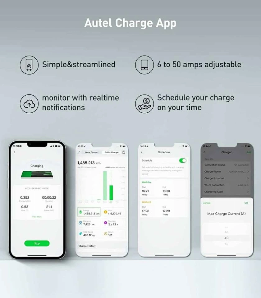 Smart APP Control - Use Autel Charge APP to control your charger and manage charge times, schedule charging while you're away, and optimize your charging to take advantage of off peak electricity. Bluetooth enabled, Wi-Fi connectivity, and Ethernet access make sure your automatic over the air (OTA) remote firmware updates keep you connected at the times you need.