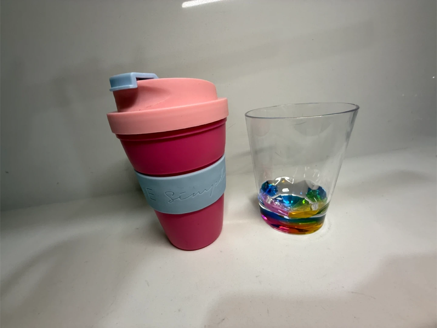 Selling a Simple Modern kids cup set. It includes a pink cup with a lid and a clear cup with a rainbow bottom. Perfect for kids!