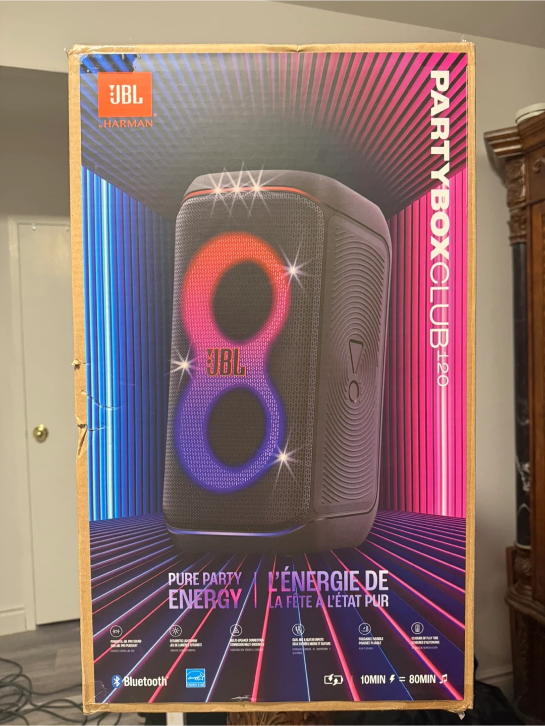 Selling a JBL Partybox Club 120 speaker. It features JBL Pro Sound and futuristic light show. It also has dual mic and guitar inputs and a foldable handle. Price is firm.