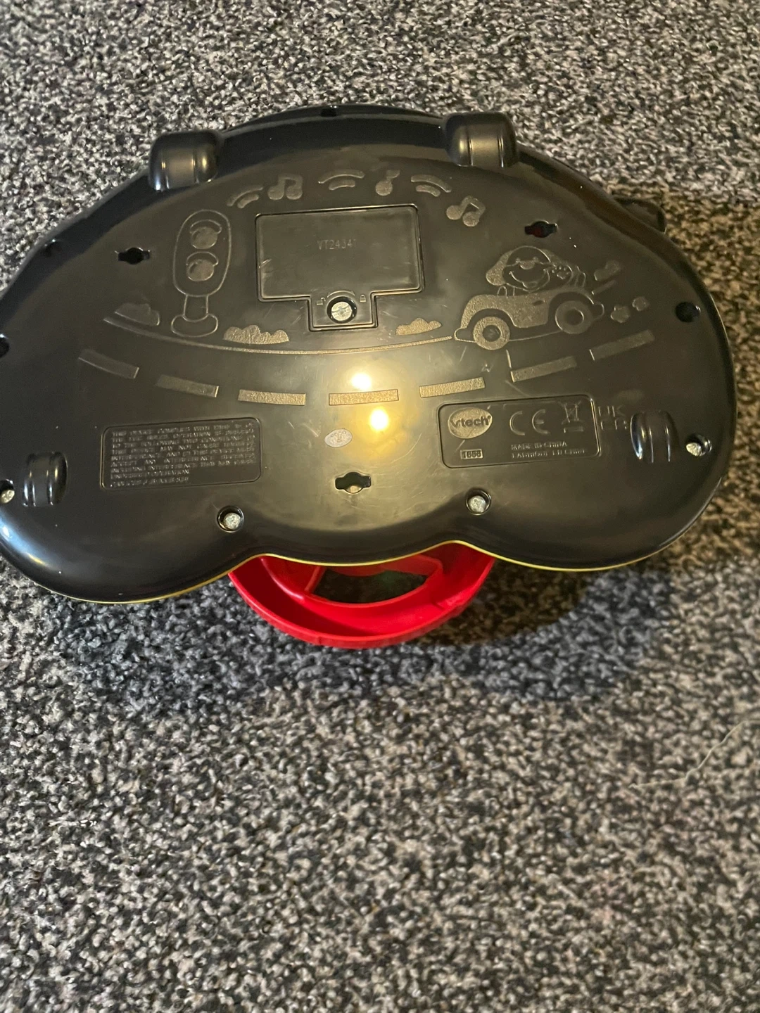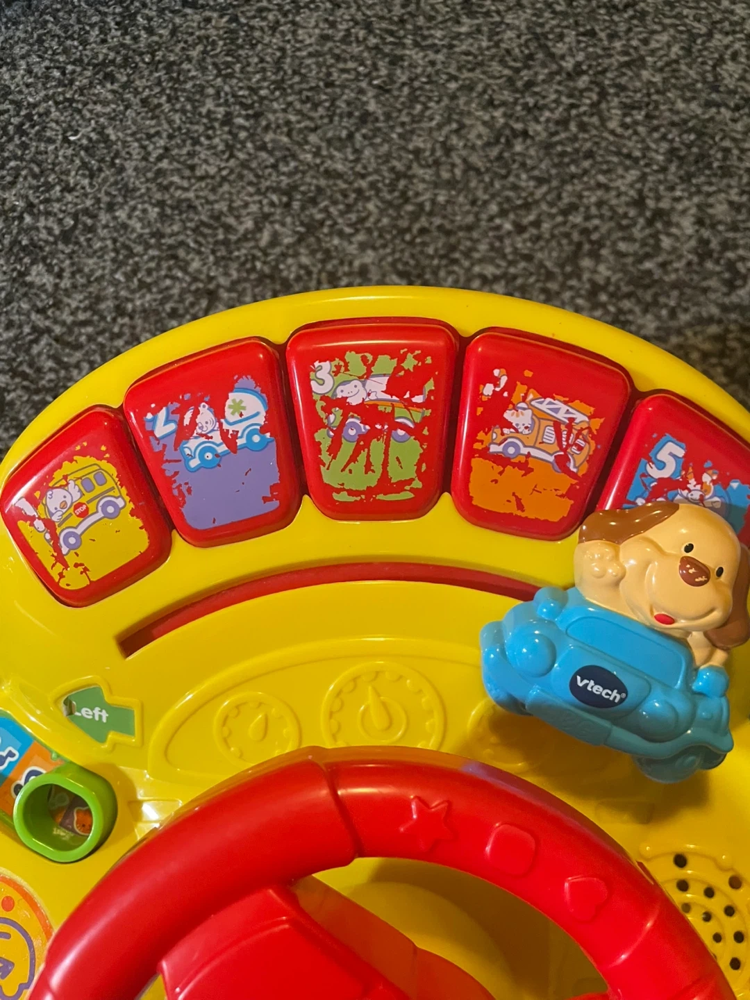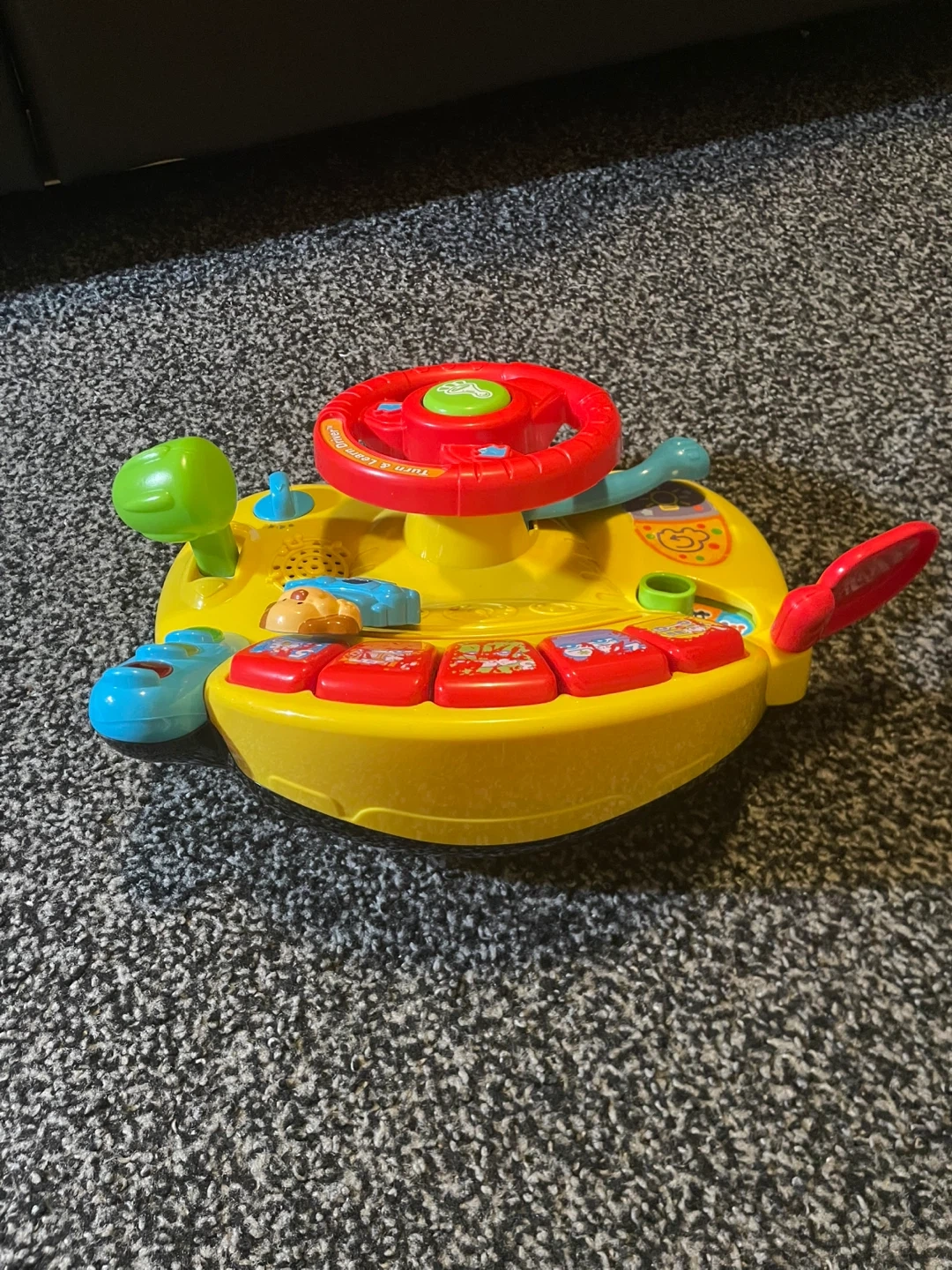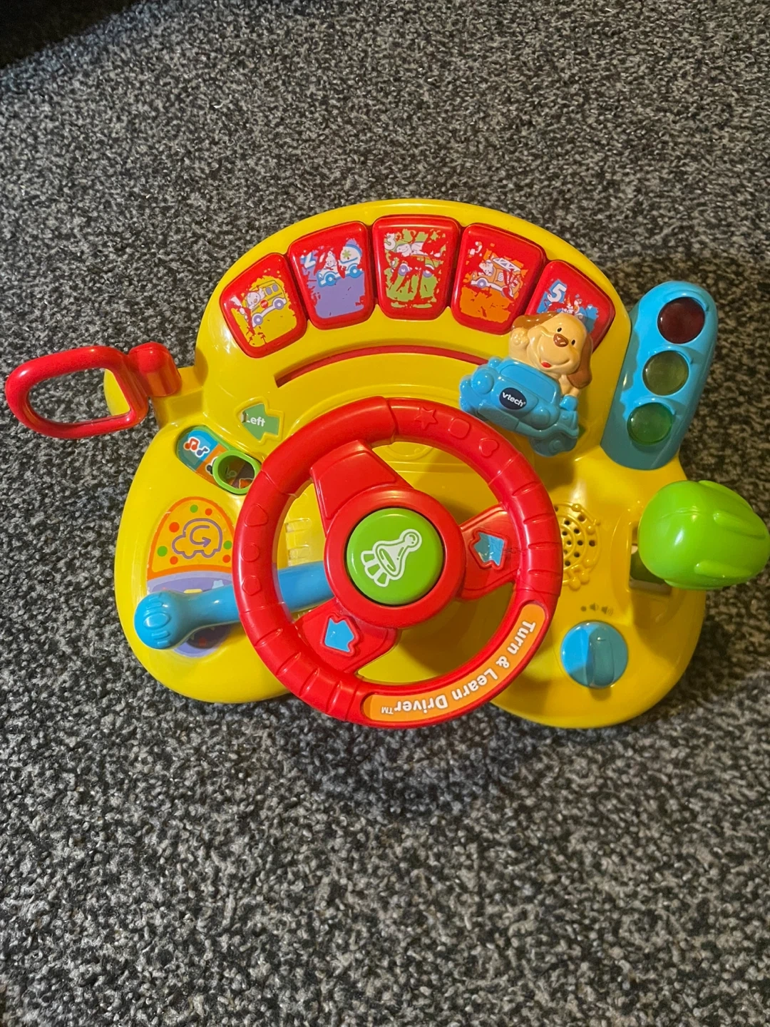 VTech Turn and Learn Driver in great condition! This fun interactive toy features a steering wheel, colourful buttons, and playful sounds to keep your little one entertained. It's perfect for encouraging imaginative play and developing fine motor skills. Toy is fully working and in good condition, the only problem is that some of the stickers and pictures are starting to come off sadly! All lights and buttons, steering wheel, etc all work! Requires 2 double AA batteries! Batteries not included! Ages 12-35 months, bought it for 23 dollars on Walmart!