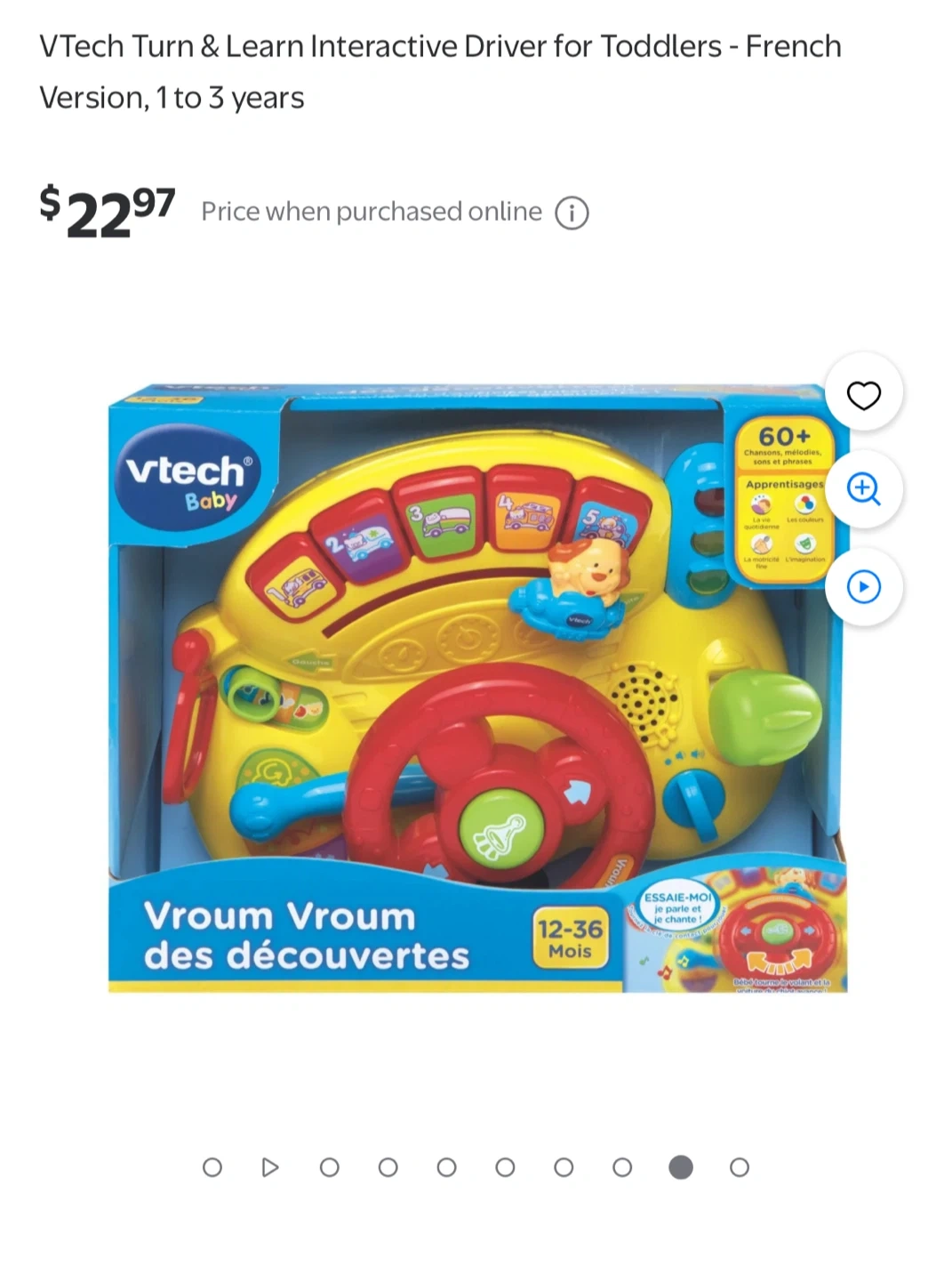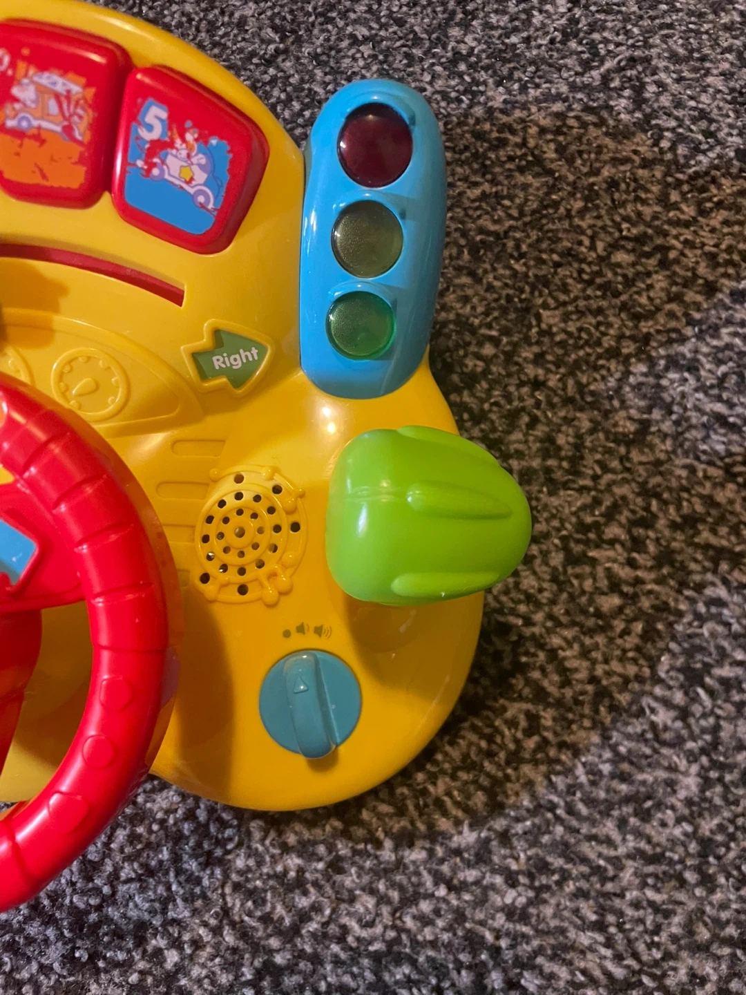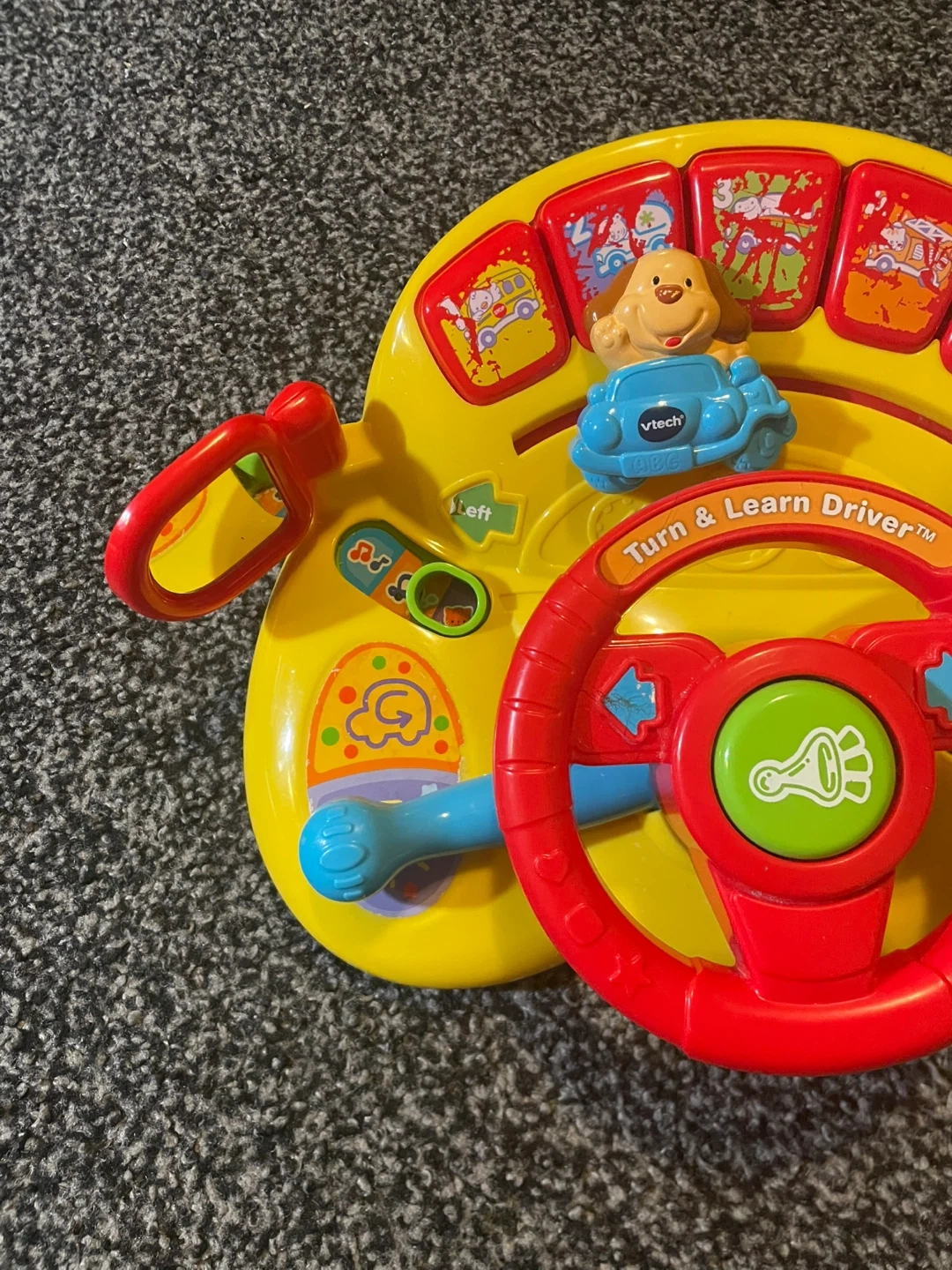 VTech Turn and Learn Driver in great condition! This fun interactive toy features a steering wheel, colourful buttons, and playful sounds to keep your little one entertained. It's perfect for encouraging imaginative play and developing fine motor skills. Toy is fully working and in good condition, the only problem is that some of the stickers and pictures are starting to come off sadly! All lights and buttons, steering wheel, etc all work! Requires 2 double AA batteries! Batteries not included! Ages 12-35 months, bought it for 23 dollars on Walmart!