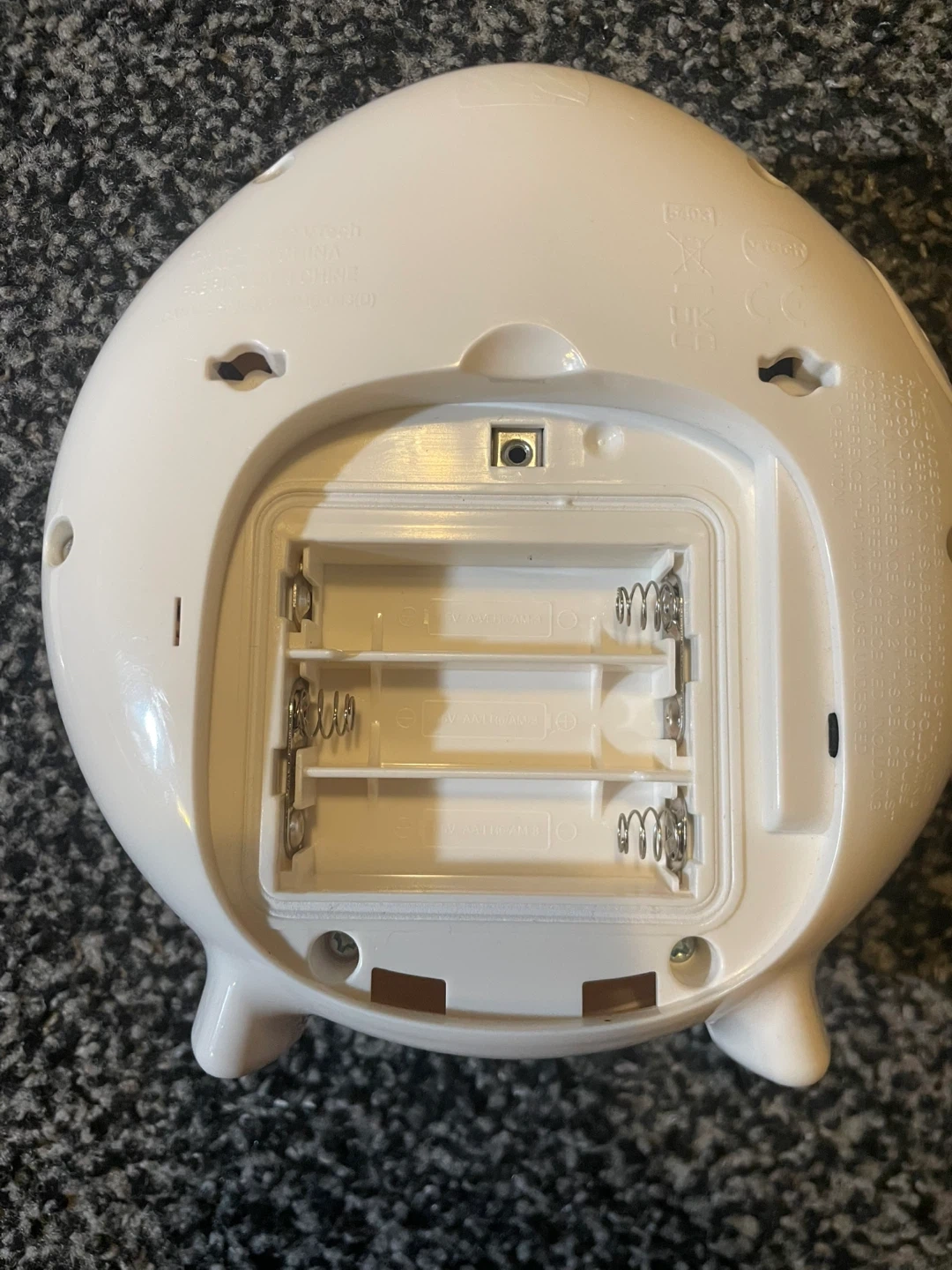 It is in good condition projector and everything else works. Has 2 timers and different types of sounds! Has a adjustable sound for the different types of sound! Has 50+ songs melodies,sounds, and phrases! This toy is the ENGLISH version not French! Requires 3 AA batteries! Batteries not included! Bought it for 30 dollars on Amazon without tax!