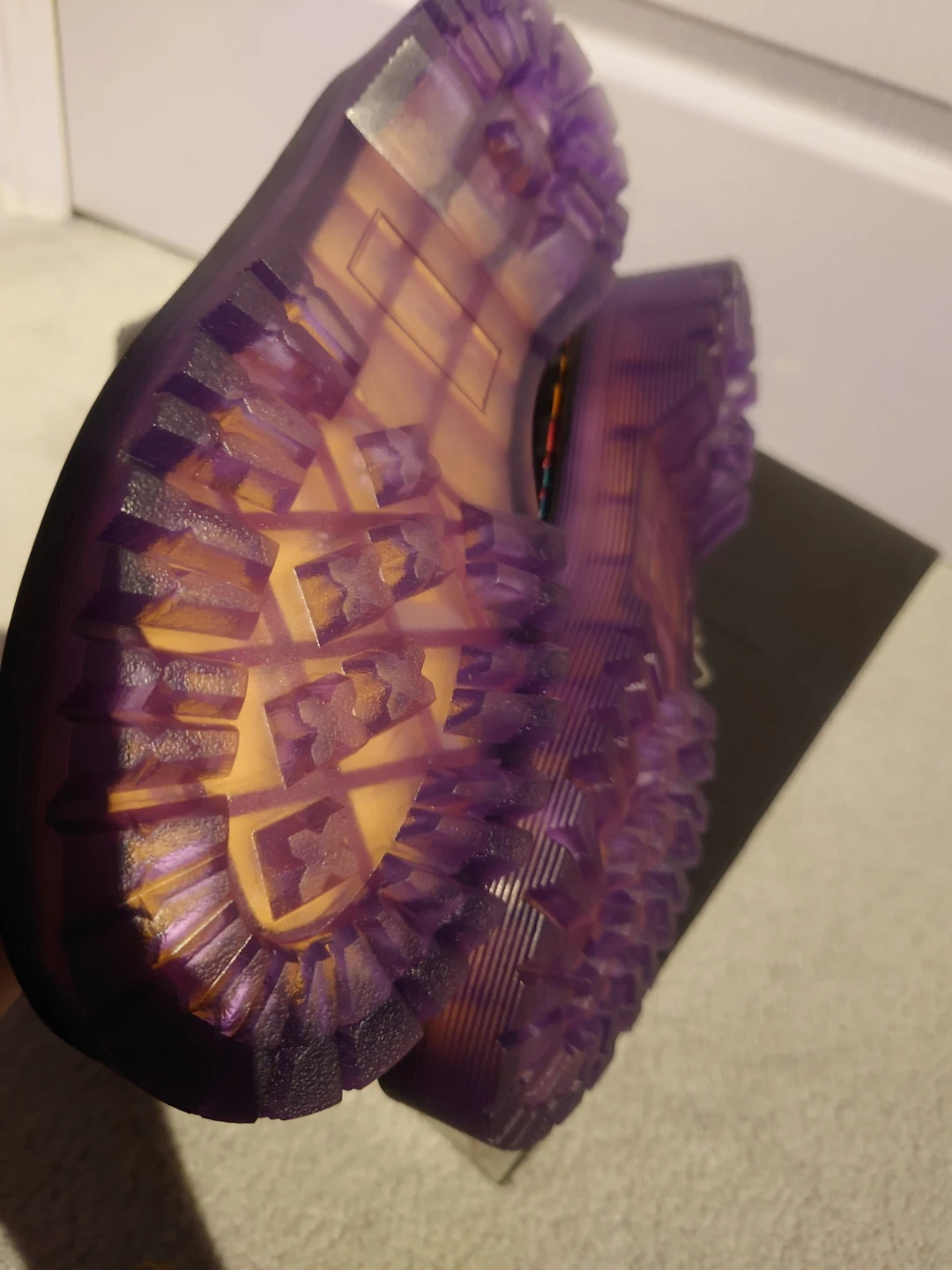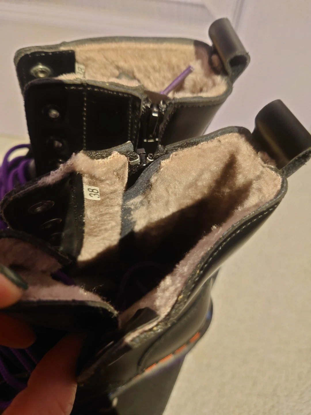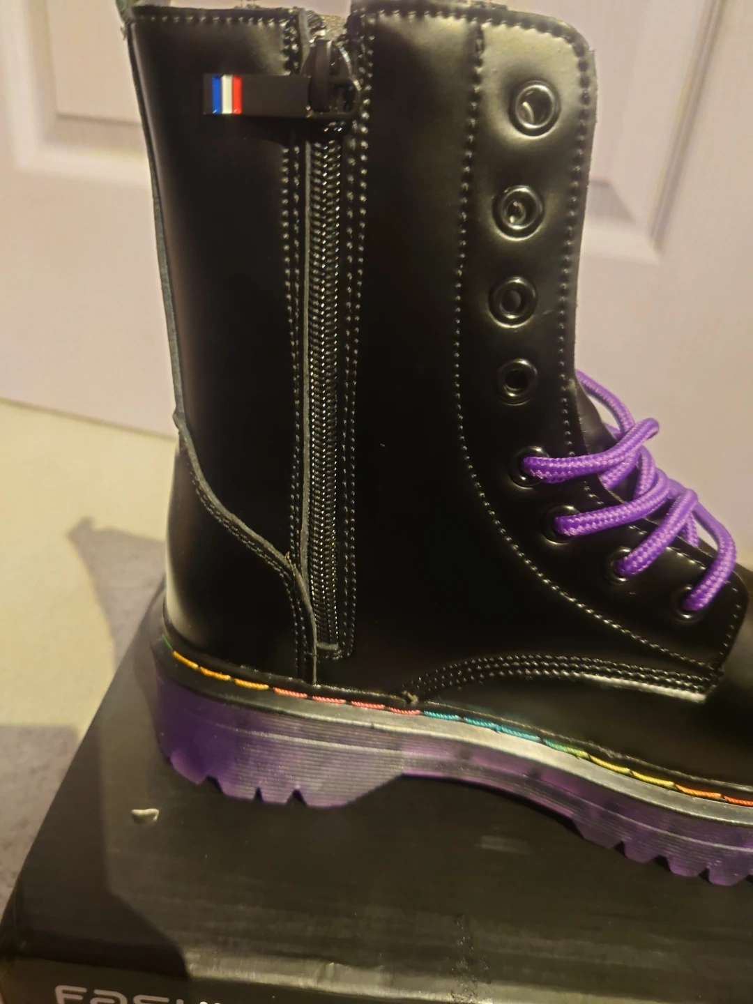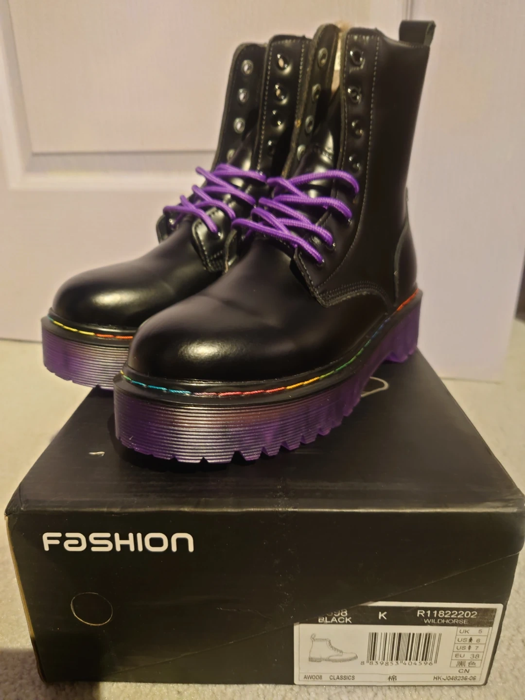 Selling a pair of Fashion brand black ankle boots in US size 7. They have a unique rainbow and purple sole. The boots are in great warm condition and come with the original box.