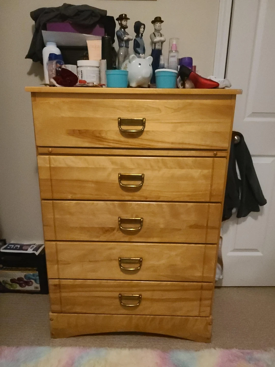 Here's a wooden dresser with five drawers! It's in good condition and ready for a new home. Perfect for adding some extra storage to your bedroom or any other space